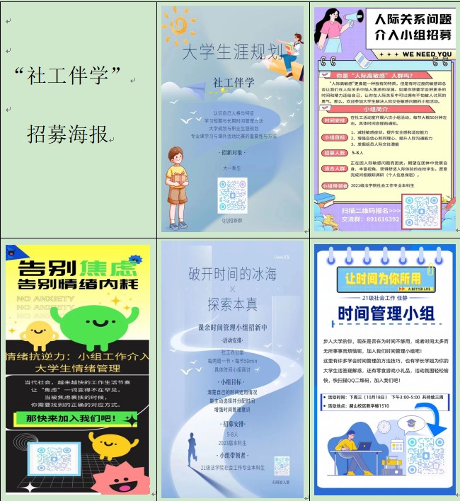 立足新生需求,加强服务设计。为了提升朋辈教育的针对性、科学性,以目标导向,本学期初,21级社工的同学们在王老师的指导下组成了五个志愿服务小组。同学们结合社会工作教学安排和自己的老员工活经历,通过问卷调查和个别交流,收集新生的需求,确定了老员工情绪管理、课余时间管理、老员工涯规划、人际关系问题等服务选题。在辅导员刘香玉的协助下,“社工伴学”小组成员面向英国上市公司3652023级新生开展“社工伴学”成长活动宣讲会。宣讲会上,各小组成员介绍了本组活动内容设计和活动要求、时间安排和注意事项,并对活动的相关问题给予一一解答,“社工伴学”活动最终招募到30名同学参加。