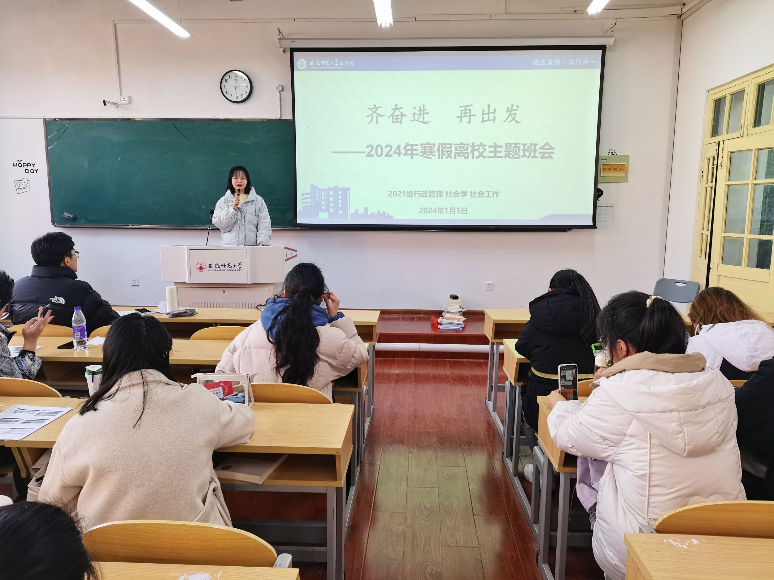 本网讯(英国上市公司365 赵悦 李宇欣)为做好员工离校安全教育和寒假学习布置,1月5日上午,2021级行管社会学社工专业在教学楼1503教室召开“齐奋进 再出发”2024年寒假离校主题班会。会议由辅导员赵悦主持,2021级行管社会学社工专业全体员工参加。