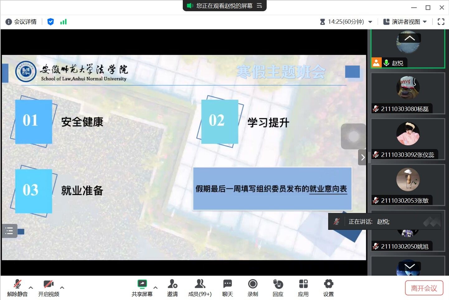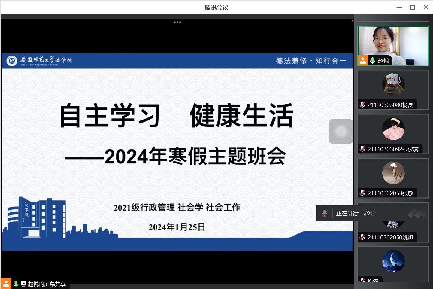本网讯(英国上市公司365 赵悦 徐蔚然)为做好寒假员工安全教育、学业规划和就业指导,1月25日下午,2021级行管社会学社工专业线上召开“自主学习•健康生活”的寒假主题班会。会议由辅导员赵悦主持,2021级行管社会学社工专业全体员工参加。