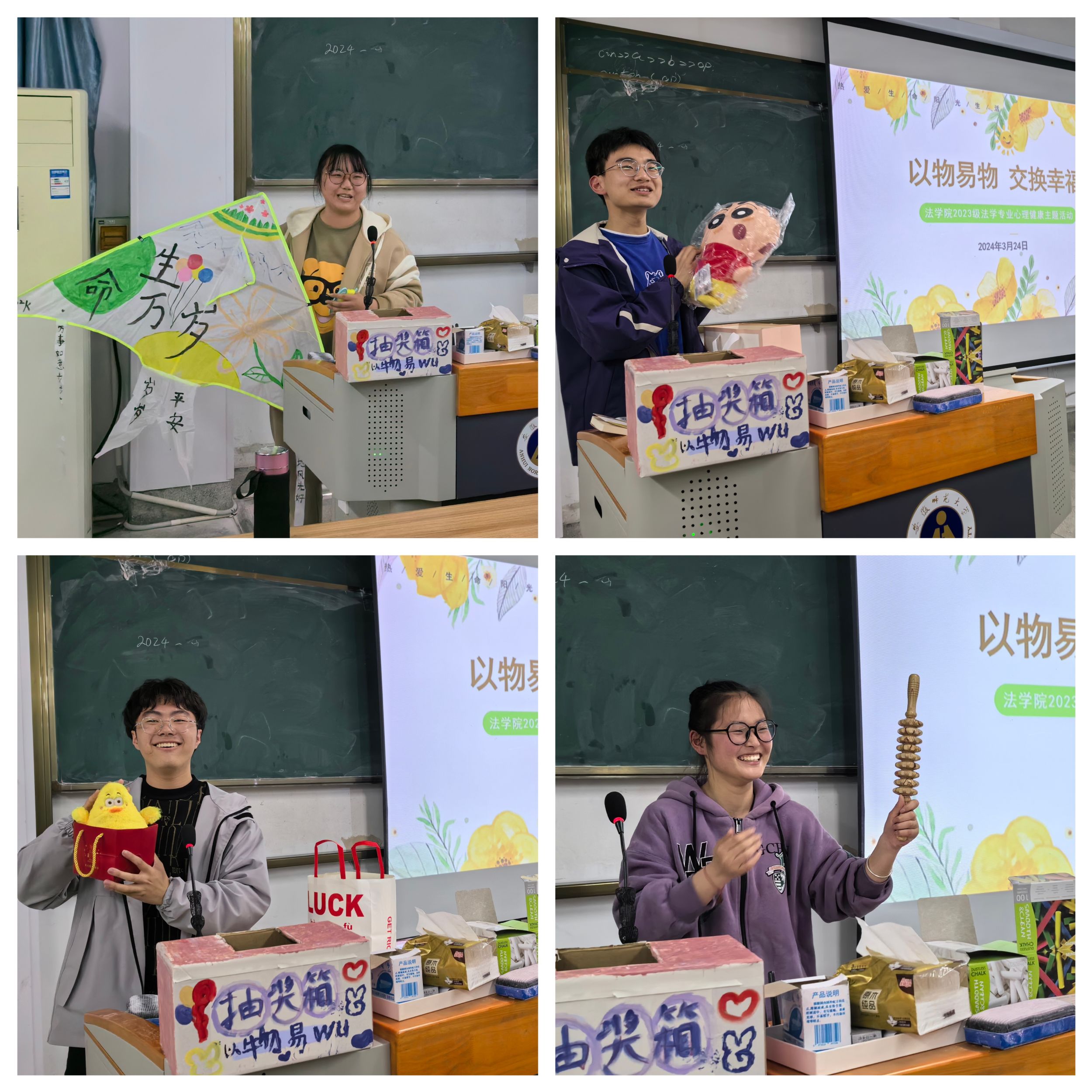 (本网讯 余清华 李晨冉)春风送暖,万物复苏。为落实和践行公司护航行动计划,促进老员工心理健康,增进同学间的相互理解和信任,加强班级凝聚力。3月25日,2023级法学专业于天门山校区开展主题为“以物易物,交换幸福”的心理健康活动。班会由卓越司法班心理委员储照玲主持,法学专业辅导员李晨冉应邀出席,2023级法学专业员工参加。