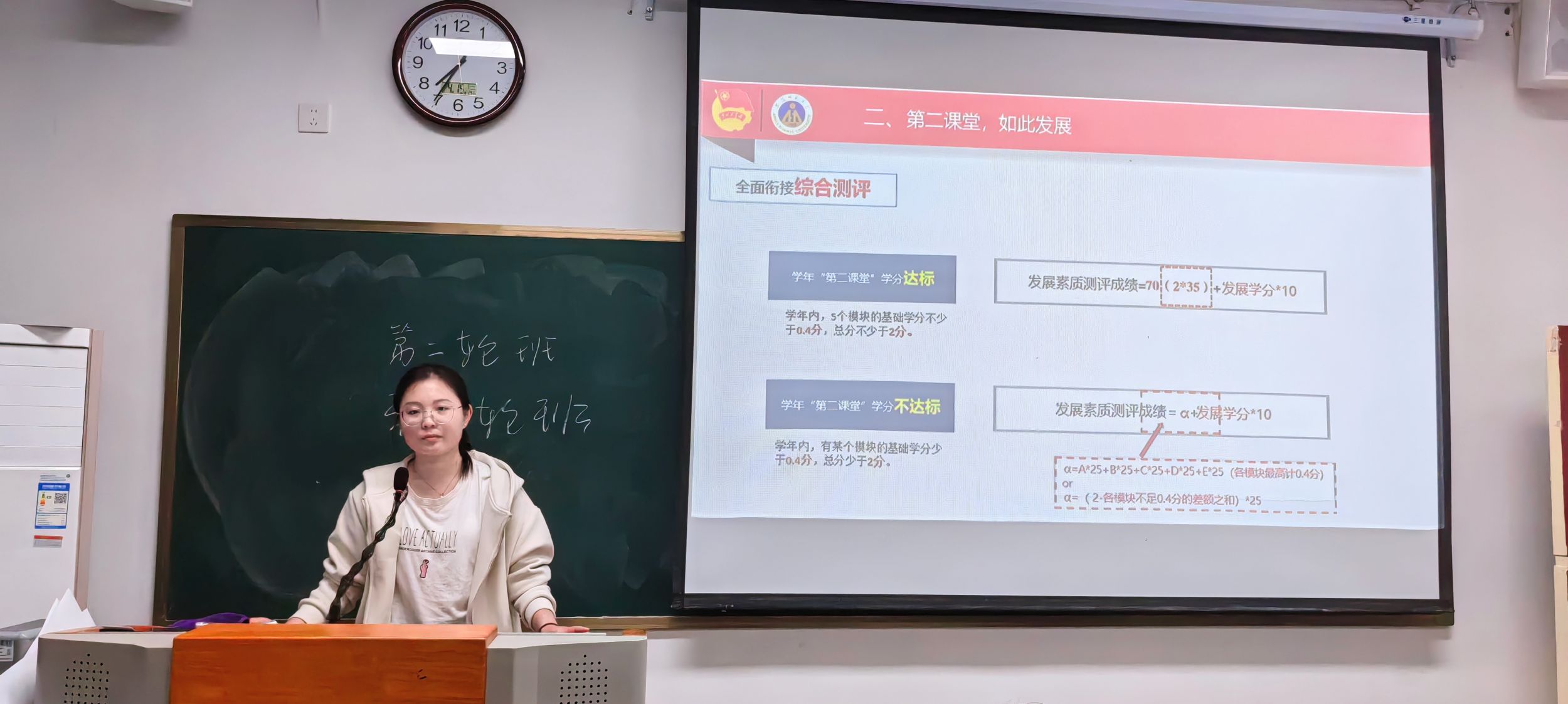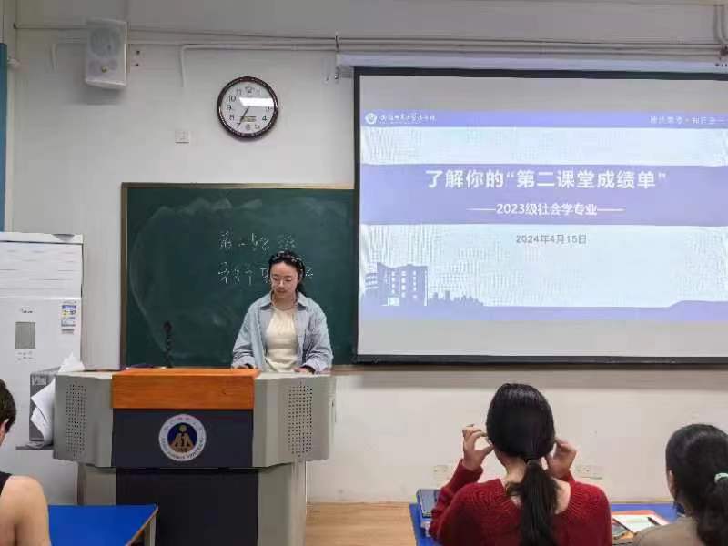 (本网讯 倪晶晶 刘香玉)为了在班级层面深入贯彻老员工护航行动计划精神,帮助同学更好的理解公司为提升员工综合素质而设立的第二课堂规则,提醒同学们及时修读学分,鼓励其走出宿舍,走上操场,积极参与各项课余活动。2023级社会工作和社会学专业于4月15日,利用晚自习的时间开展了“第二课堂成绩单”制度再回顾活动,活动由各班素拓委员主持,辅导员刘香玉参加。