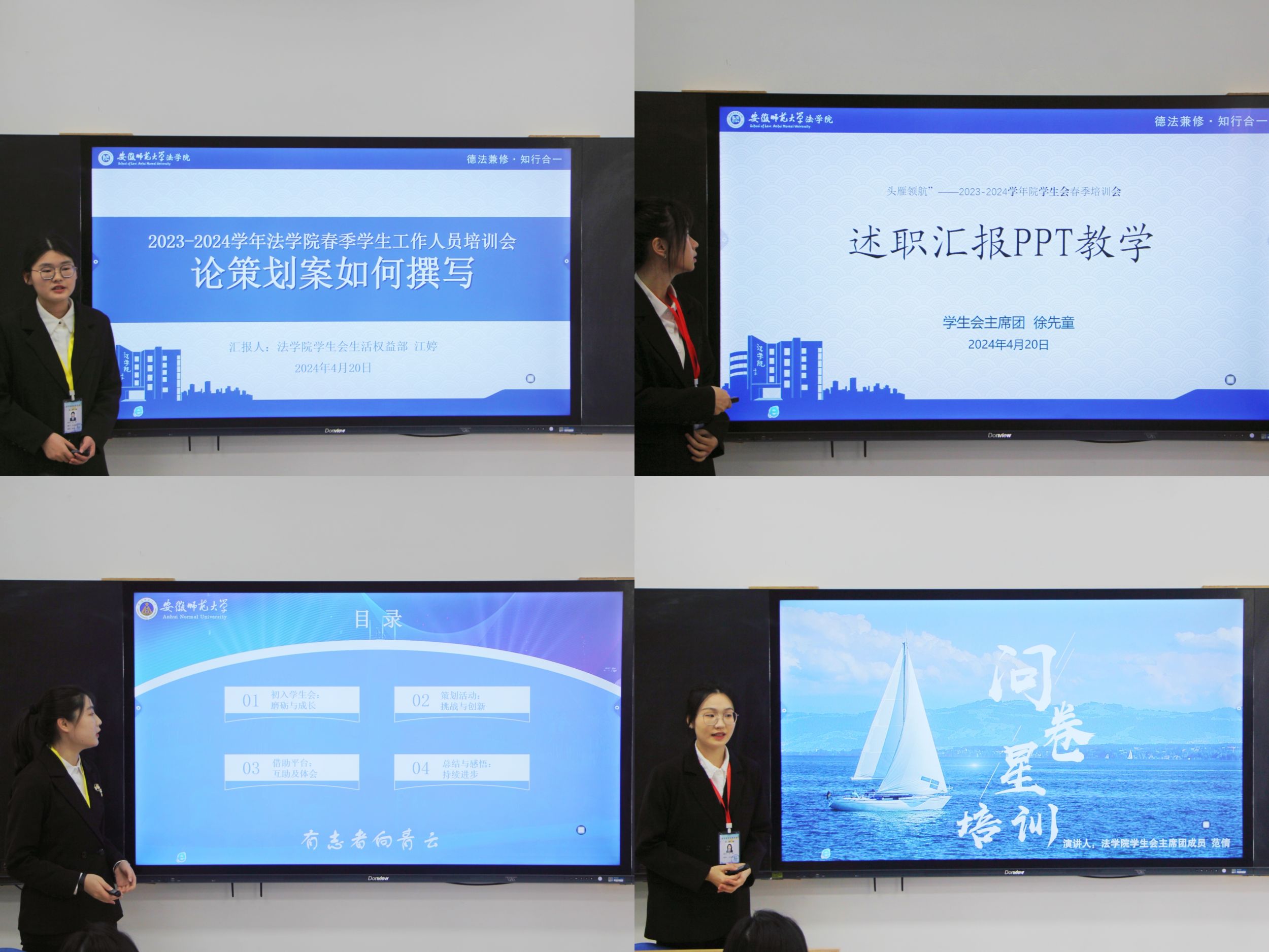 会议开始员工会生活权益部负责人傅子涵以“你想度过怎样的‘工作生涯’”为主题进行了发言,在总结个人工作情况的同时分享了工作经验。随后主席团成员徐先童、范倩及生活权益部负责人江婷先后围绕PPT制作与优化、调查问卷设计、策划案撰写等主题开展了讲解培训。整个学习过程中团委、员工会工作人员纪律严明、学习认真,展现出了良好的精神风貌。