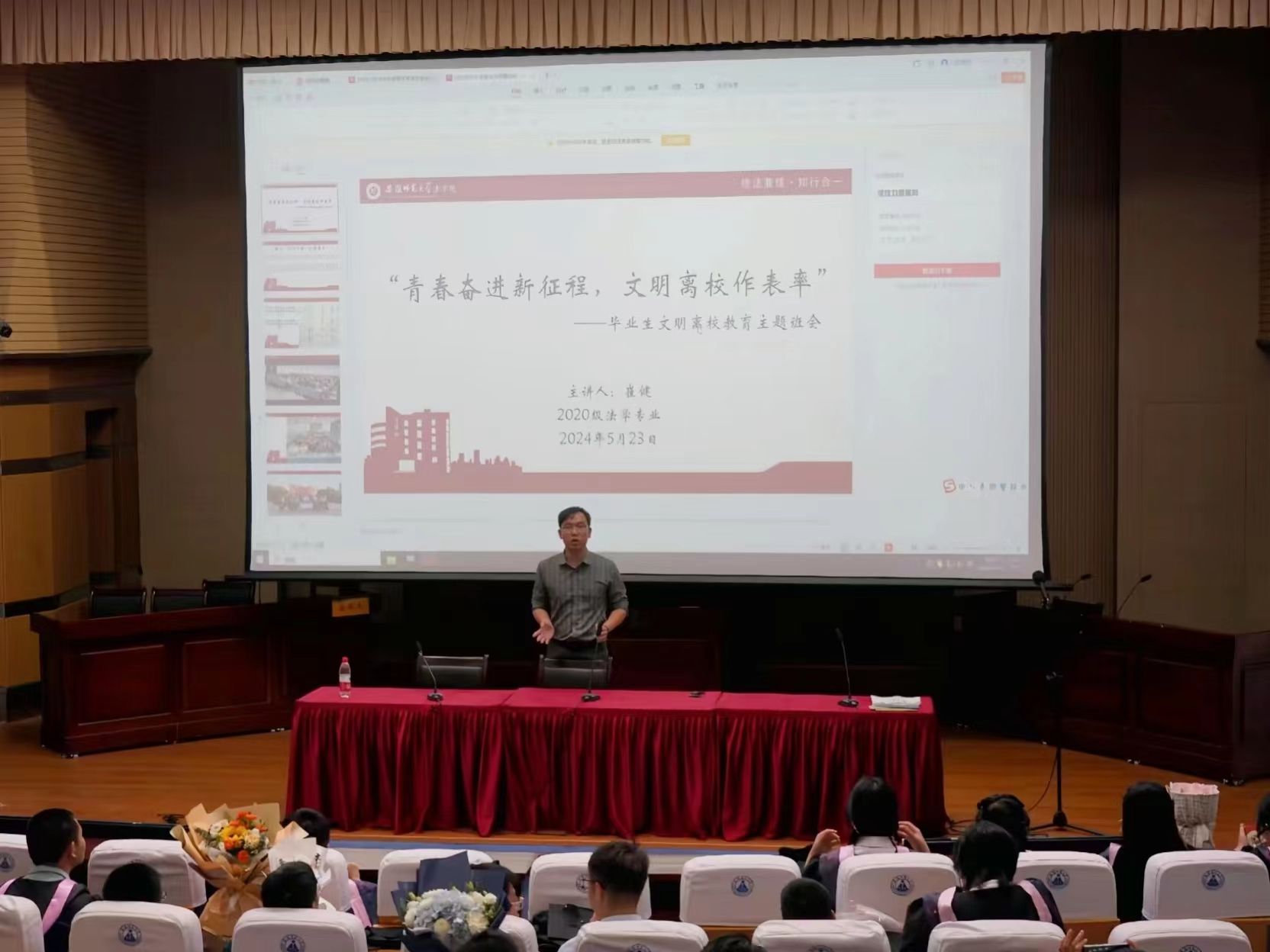 班会伊始,崔健说明毕业生离校相关事宜及注意事项,强调文明离校的重要性,倡导全体毕业生遵守校纪校规,以文明、有序的方式告别母校。他详细阐述了离校前打扫干净宿舍、主动归还钥匙、遵守交通规则等“六个文明”方面的具体要求,希望毕业生们能够以身作则,自觉展示毕业生的良好素质和形象,为学弟学妹们树立榜样。