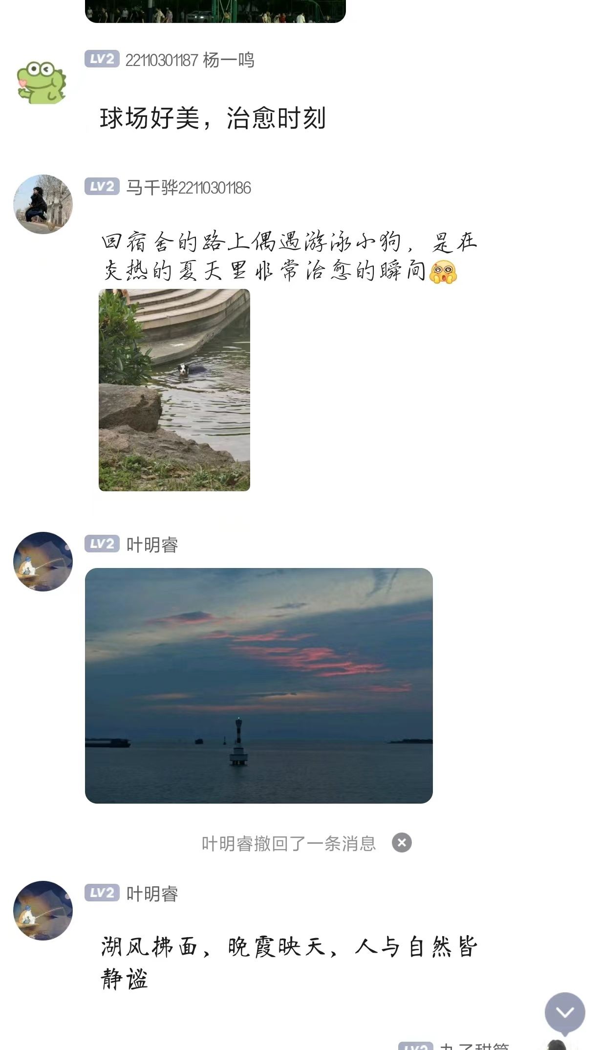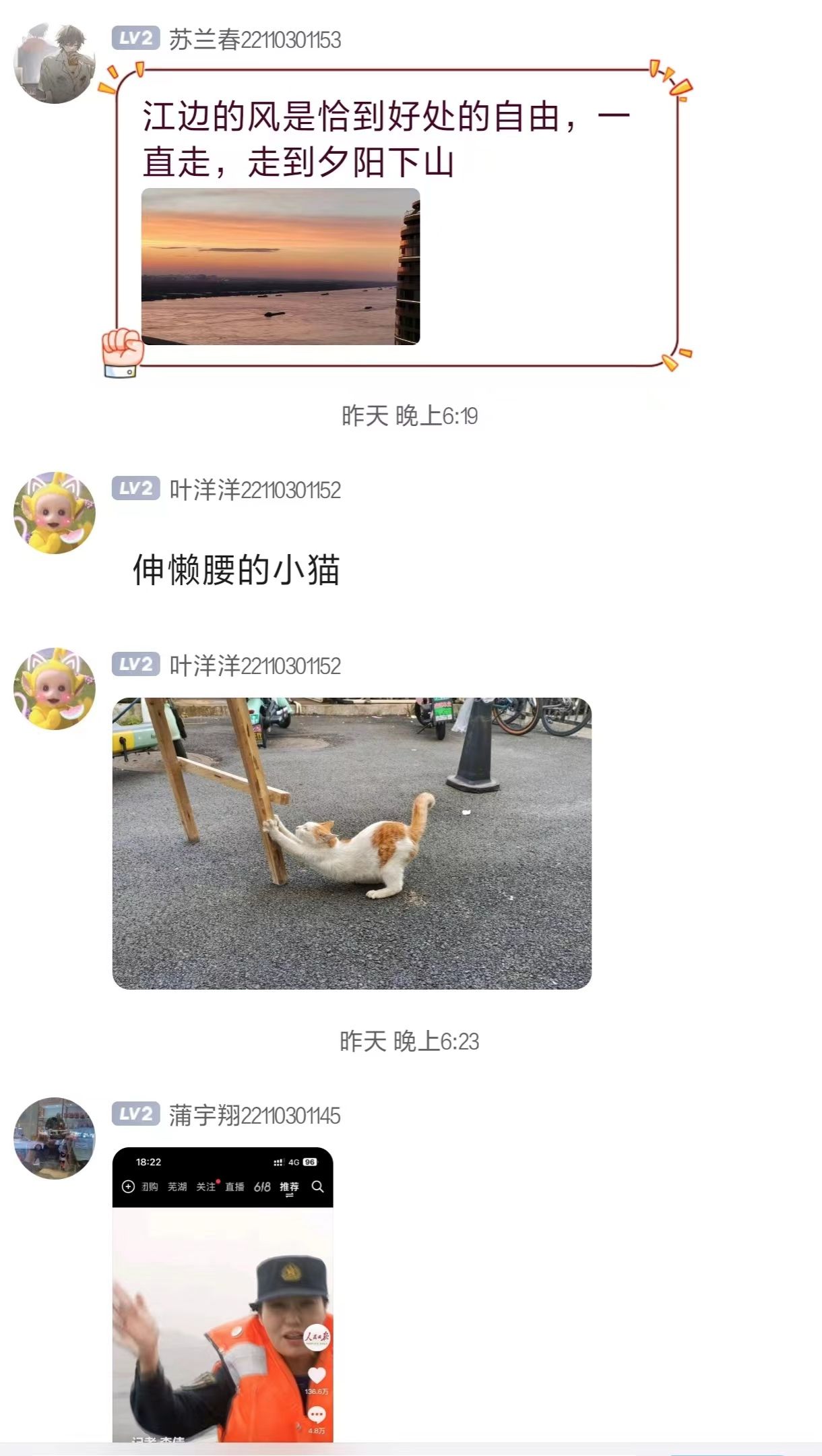 定格美好,治愈生活。为促进同学们发现生活中的美好,留意生活中治愈瞬间。法学3班进行分享生活中美好小事活动,在群中分享自己拍摄的美好瞬间,并讲述拍摄感想,鼓励同学们发现生活中的小美好,以乐观的心态和理智的思维正确处理生活中的困难和问题。