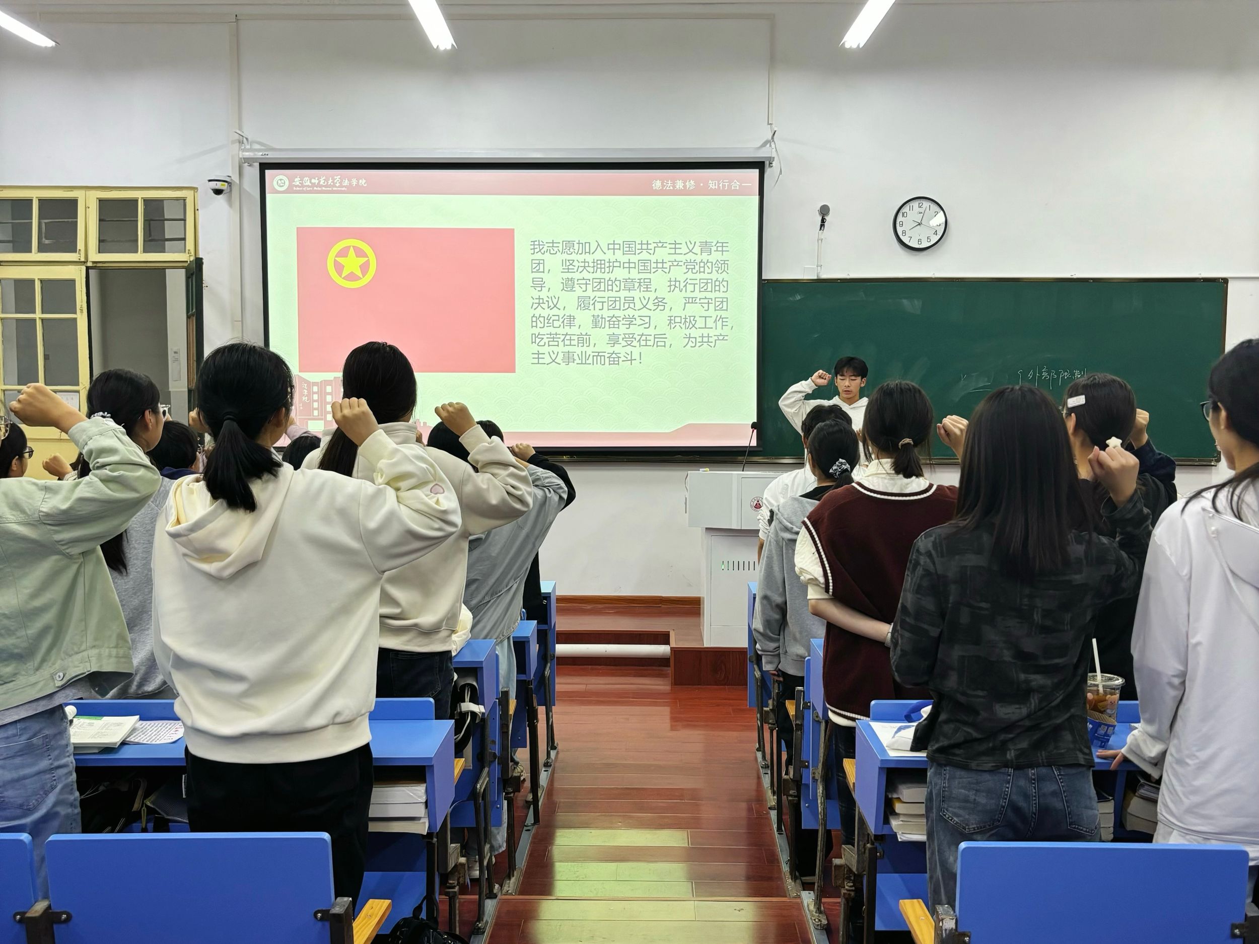 一次团歌教唱。文体委员耐心教导全体新生学习团歌,“我们是五月的花海,光荣啊,中国共青团,用青春拥抱时代…………”,象征“五四”青年精神的歌曲与初秋幽幽桂花香悠扬回荡于校园里,激发每一位青年学子去发掘内心对党和国家的赤诚的爱。