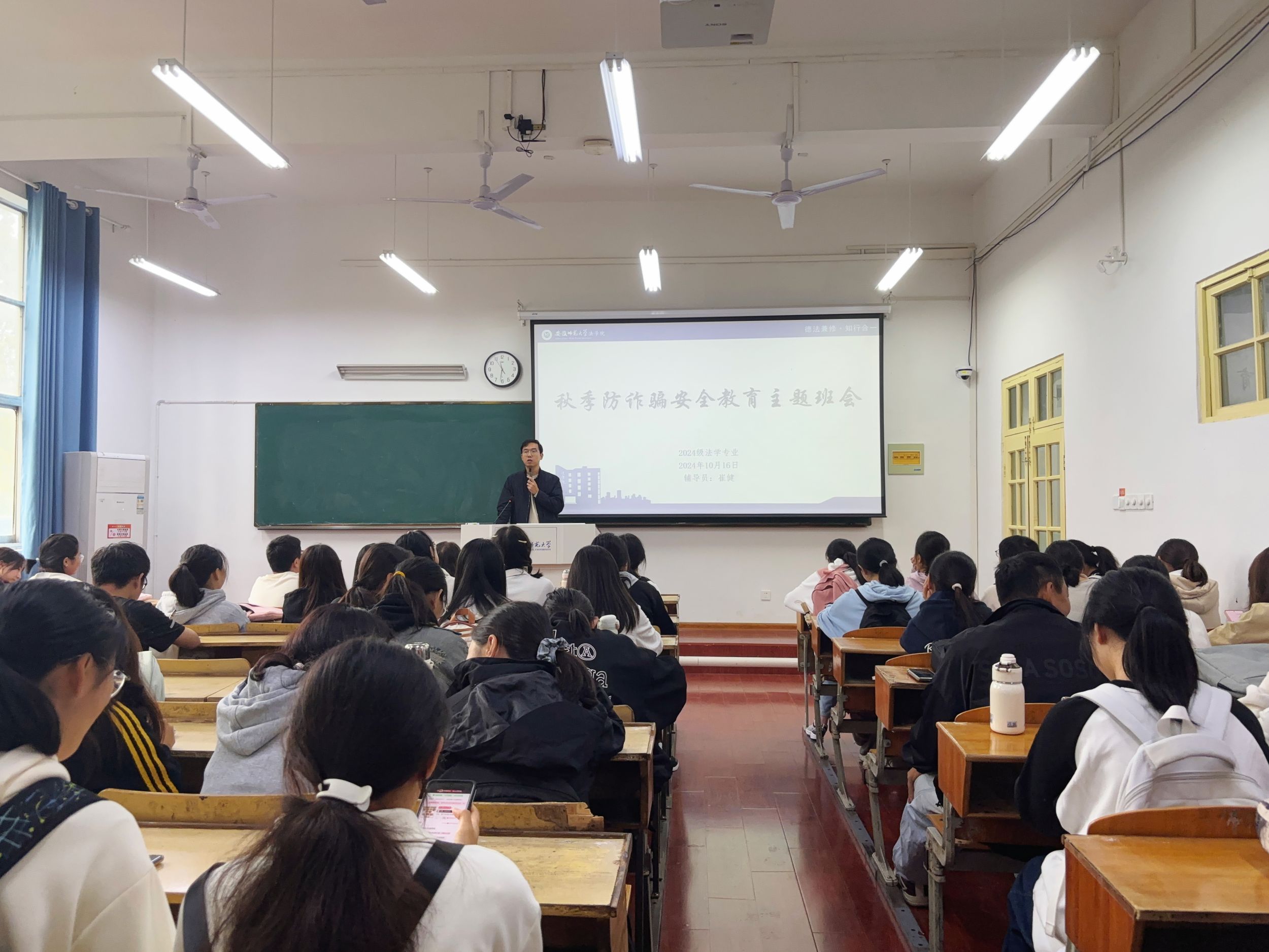 为贯彻落实公司“老员工护航行动计划”,提升新生安全防范意识,保障人身财产安全,2024年10月16日,2024级法学专业于教学楼1403教室召开秋季防诈骗安全教育主题班会,会议由辅导员崔健主持。全体同学参加会议。