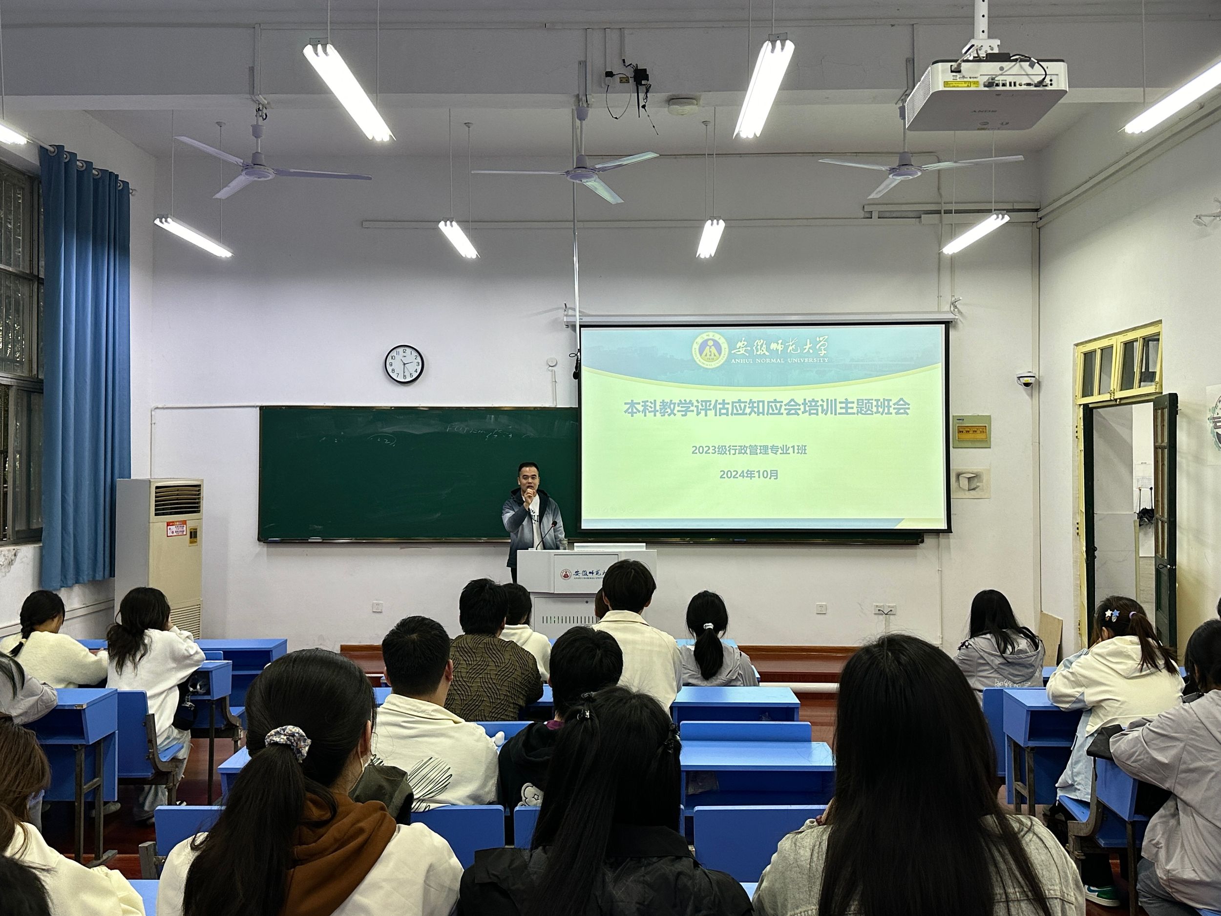 2024年11月1日,2023级行政管理专业于教学楼1104召开本科教学审核评估应知应会培训主题班会,旨在让同学们深入了解本科教学评估的相关内容和要求,确保在评估过程中展现出良好的精神风貌和学习氛围。此次班会由辅导员陈兴宇主持,全体同学参加。