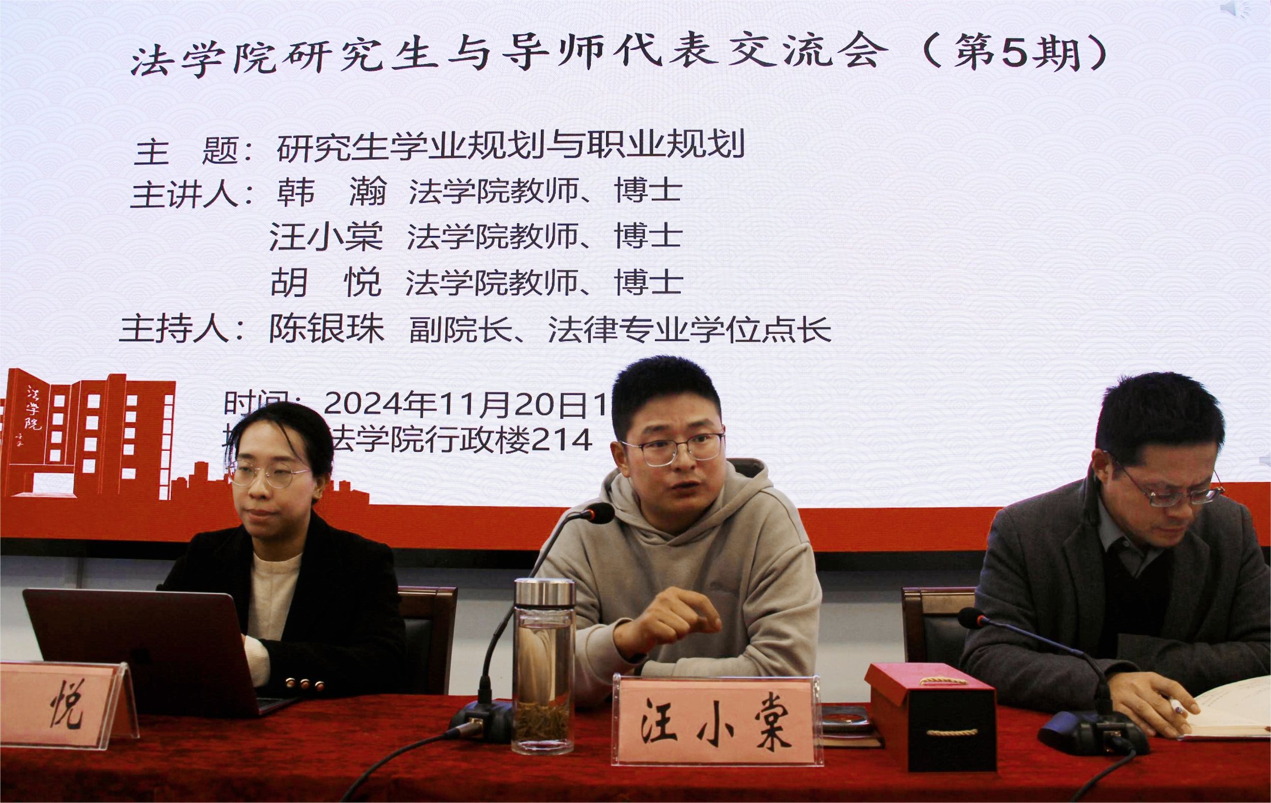11月20日下午,英国上市公司365研究生与导师代表交流会(第5期)“研究生学业规划与职业规划”专题在公司行政楼214教室顺利召开。本次会议特别邀请到英国上市公司365教师汪小棠、胡悦担任主讲人,英国上市公司365师生代表参加。活动由英国上市公司365科研副经理、法律专业学位点长陈银珠主持。