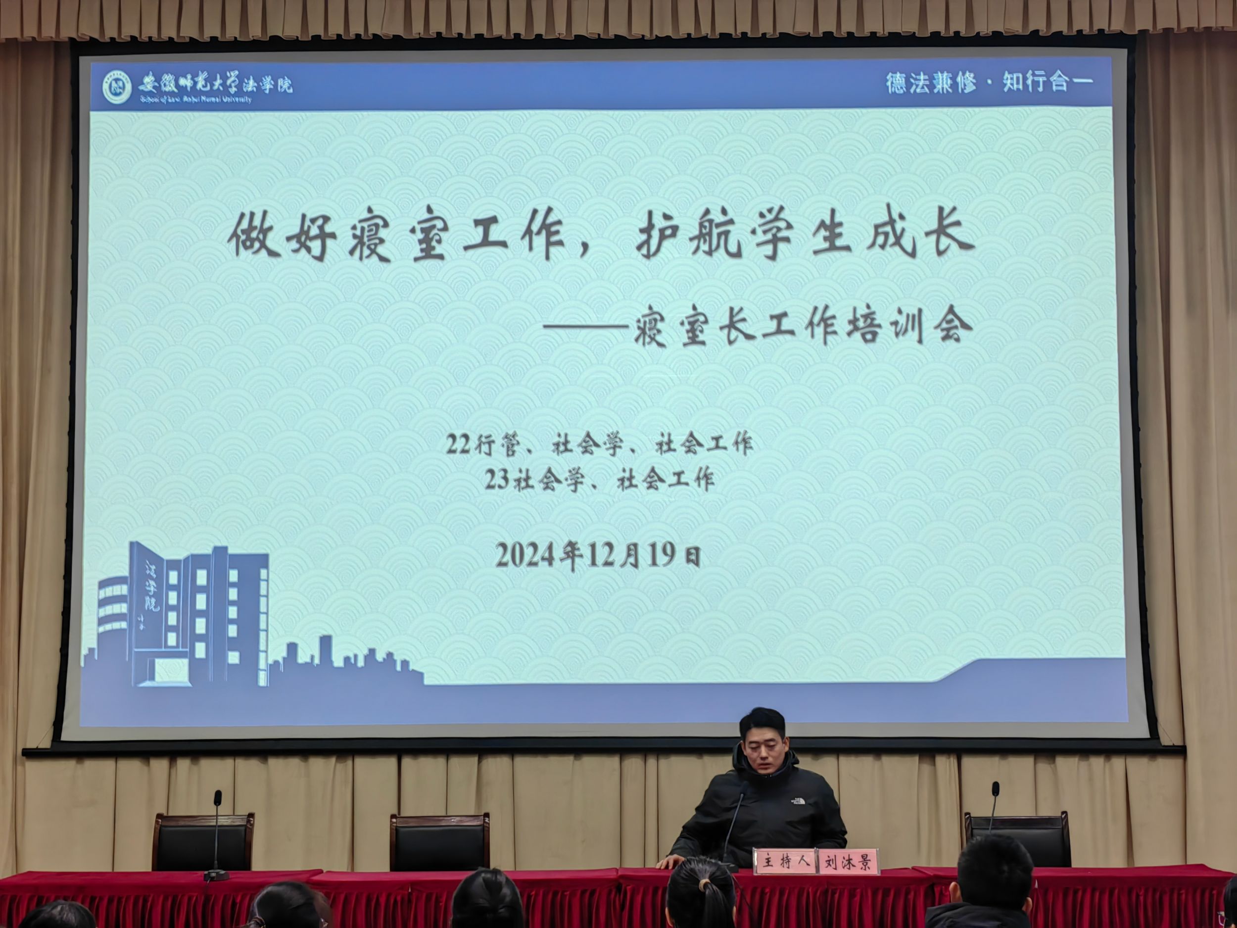 为提升寝室长管理能力,营造安全和谐的寝室氛围,12月19日下午,22、23社会学社工、行管寝室长开展以“做好寝室工作,护航员工成长”为主题的寝室长工作培训会,会议由辅导员刘沐景主持。