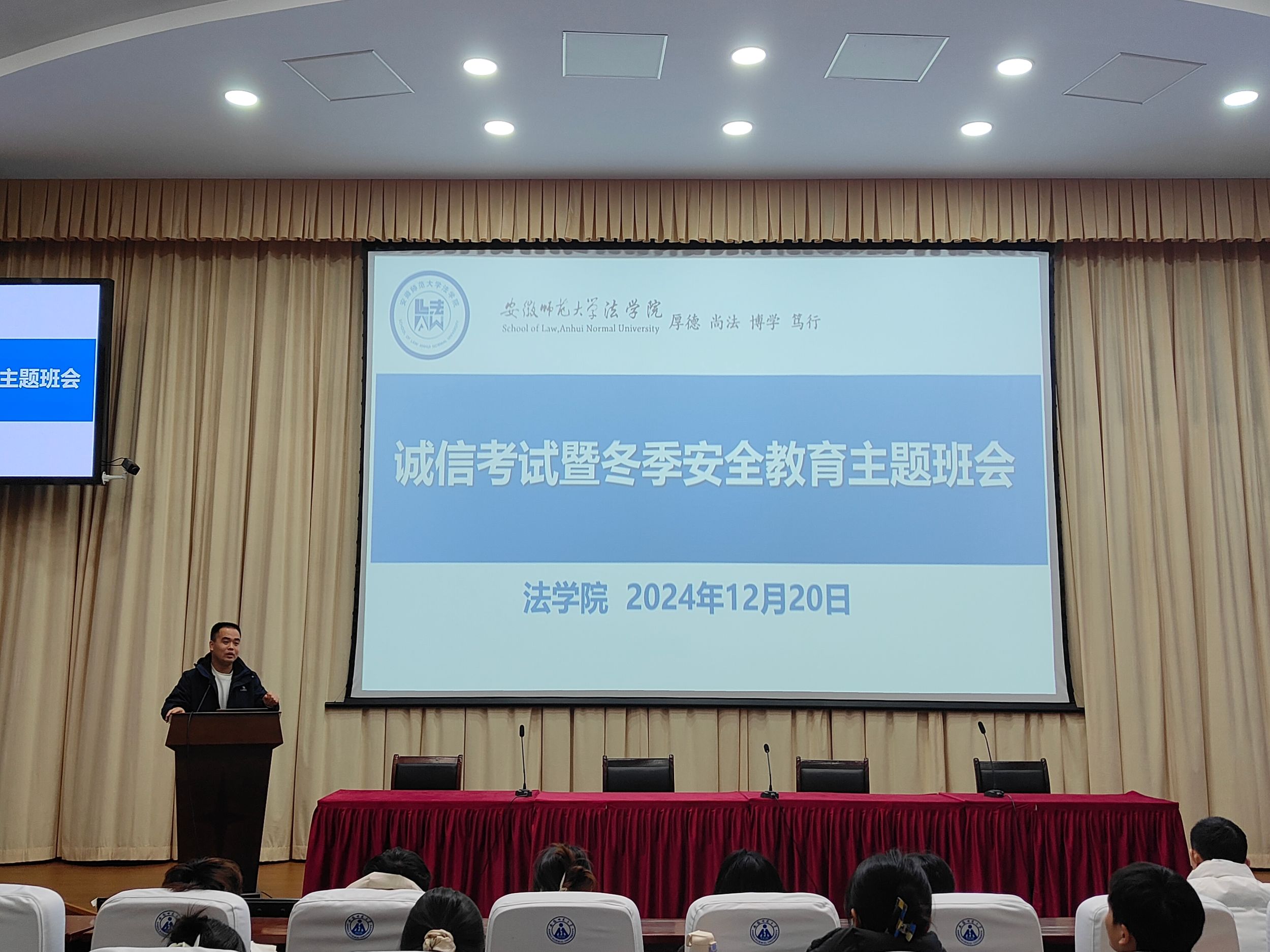 岁月匆匆,不觉间又是一季。值本学期期末之际,为进一步增强员工的诚信意识和冬季安全防范能力,班级于2024年12月20日上午在教学法庭召开诚信考试暨冬季安全教育主题班会。班会由辅导员陈兴宇主持,2023级全体研究生参加。