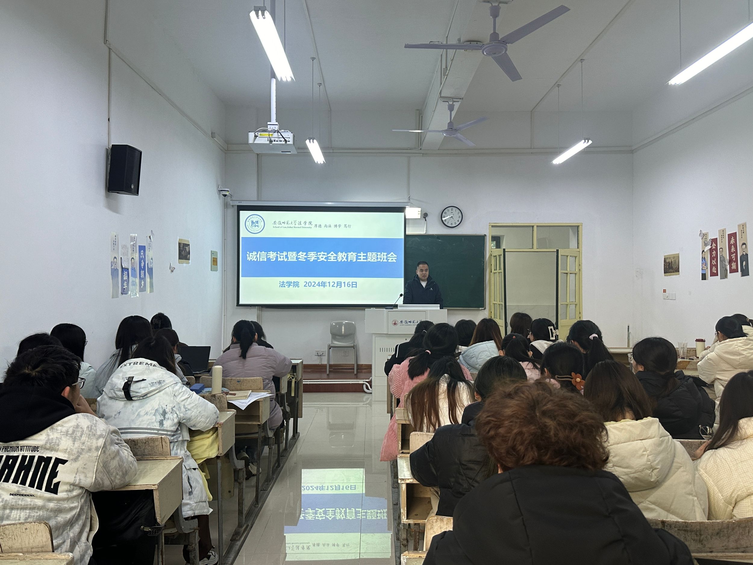 为强化同学们的诚信意识,确保期末考试的公平公正,同时提升同学们的安全防范认知。2024 年 12 月 16 日,2023 级行政管理、22法学1班、卓越司法班在教学楼 1410 室召开了诚信考试暨冬季安全教育主题班会,会议由辅导员陈兴宇主持。