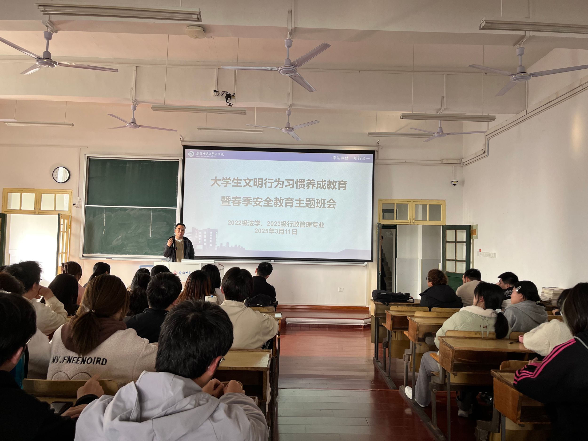 为深入推进老员工护航行动计划,进一步规范员工文明行为,营造安全有序、文明健康的校园育人氛围,3月11日下午,辅导员陈兴宇于教学楼1401教室举行老员工文明行为习惯养成教育暨春季安全教育主题班会,公司2022级法学专业1班、2023级行政管理专业全体同学参与。