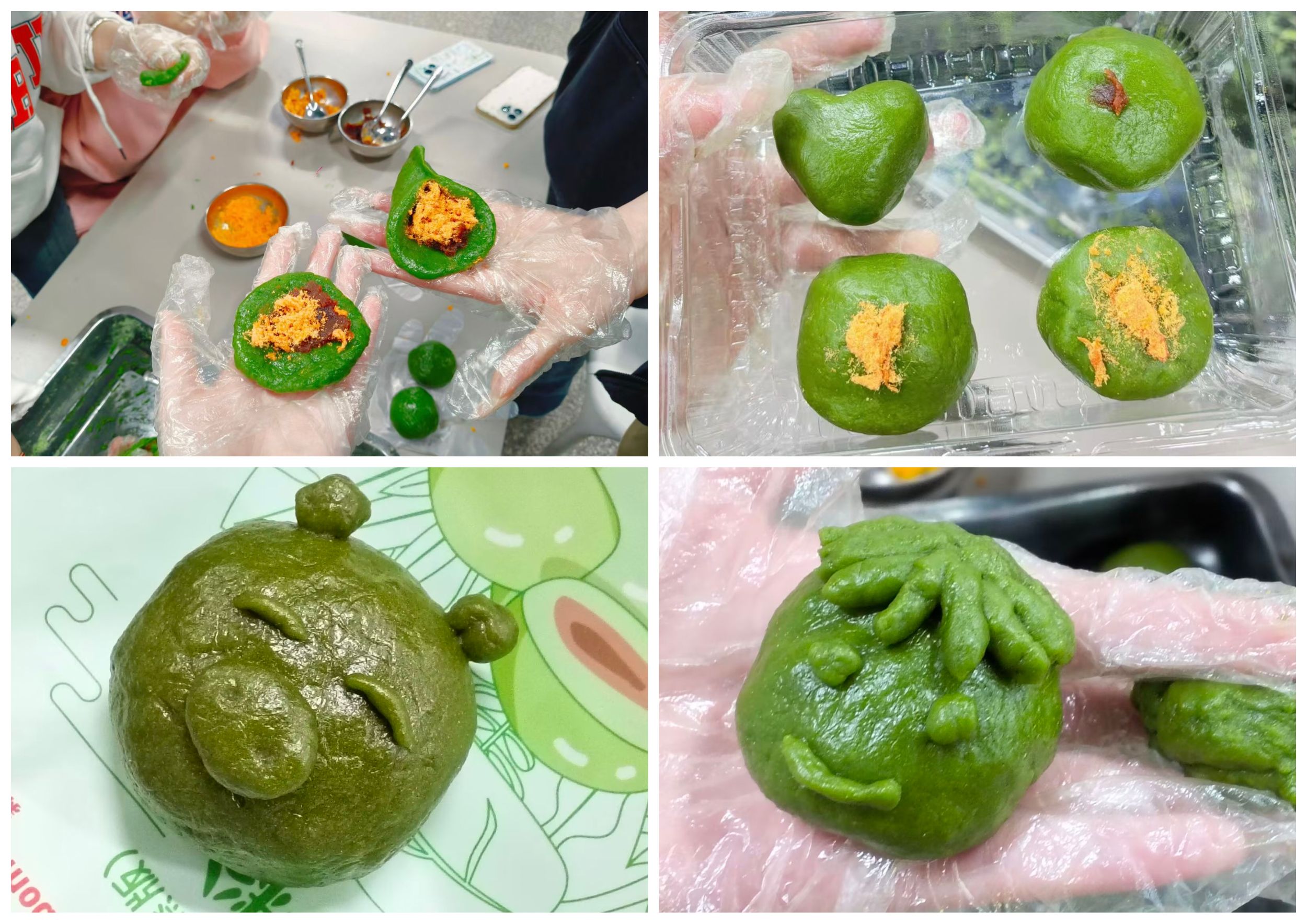 随着制作渐入佳境,同学们纷纷发挥创意,制作过程中在保留传统工艺的基础上融入个性化表达,有的将现代元素与传统纹样结合,有的尝试不同馅料搭配,大家互相分享经验、调整手法,就餐桌变身创意工坊,传统青团在年轻学子的巧思中焕发新活力。