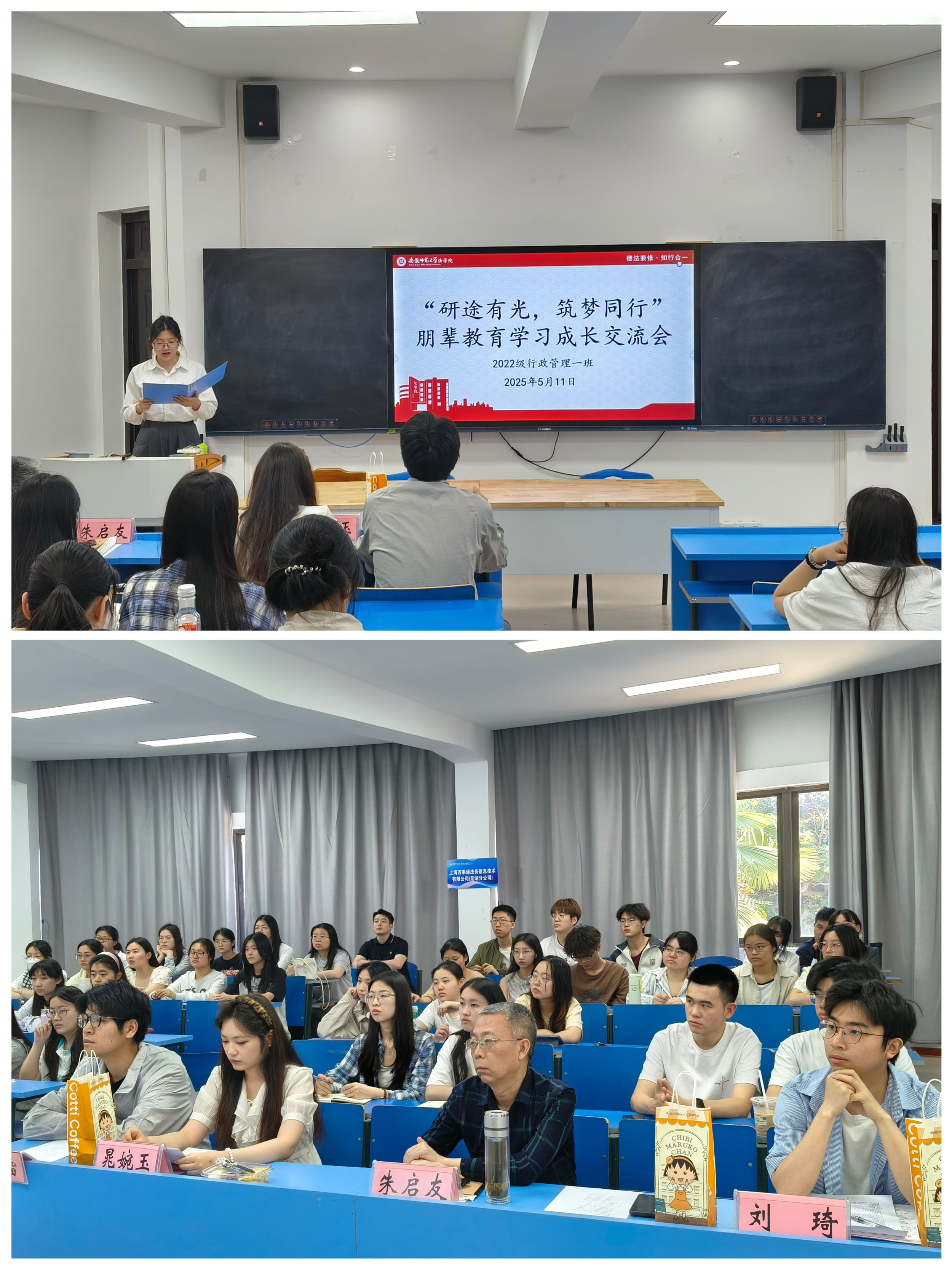 为深入贯彻落实老员工护航行动计划,充分发挥朋辈教育的示范引领作用,帮助行政管理专业学子明晰学业规划、坚定考研信心,5月11日下午,2022级行政管理专业在行政楼113教室举办“研途有光,筑梦同行”朋辈教育学习成长交流会。会议由陈妍文主持,班主任朱启友、辅导员刘沐景出席,全体同学参与。