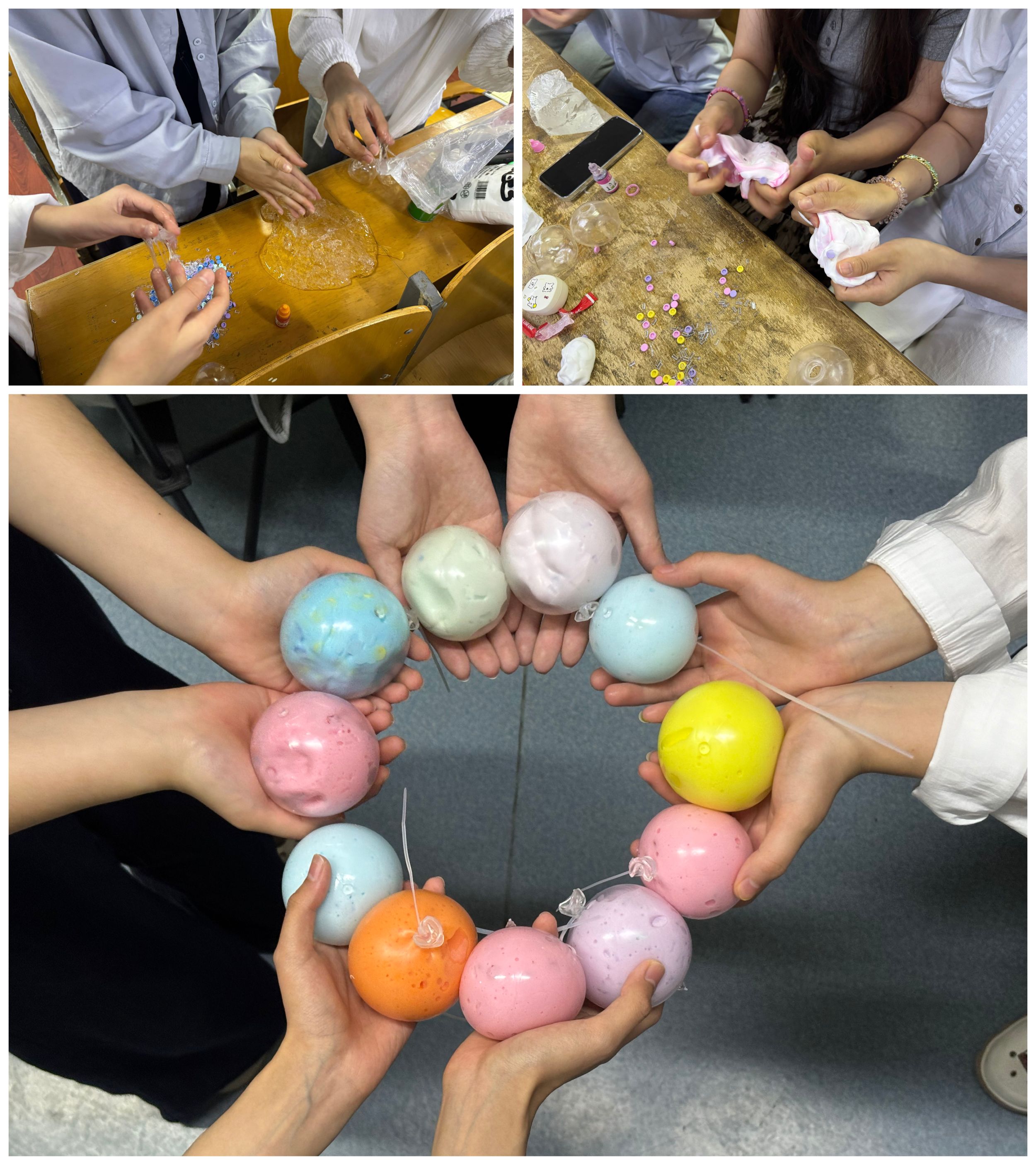 观影结束后,活动转入创意手作环节。班级提前为六人小组备齐剃须泡沫、超轻黏土等材料工具和零食礼包,同学们化身“手作艺术家”,通过揉捏、塑形、拼接,将奇思妙想凝于掌心。活动现场,有人专注雕琢“抽象派”艺术球,有人合力拼接团队作品,欢声笑语间压力悄然消散。“原来捏黏土这么解压!看着材料变成作品,成就感爆棚!”汪鑫同学感慨道。