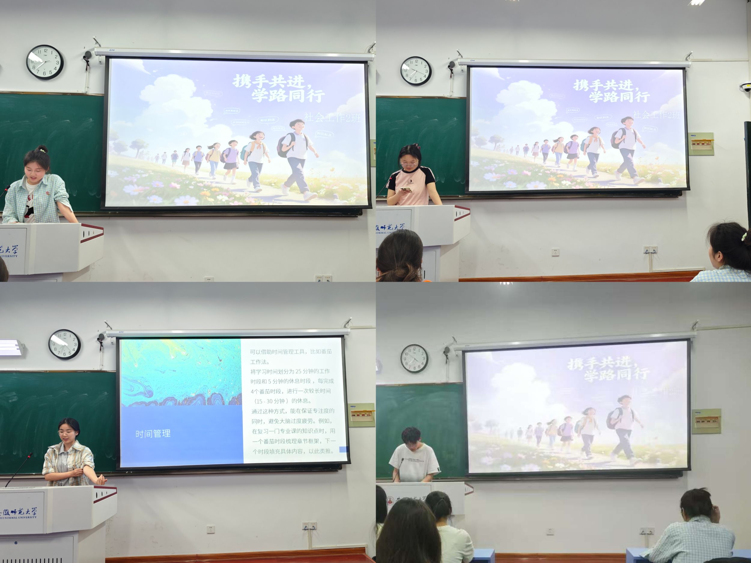 活动以“经验共享·互助成长”为主题,每周日晚自习固定开展学习组长分享会。各学习互助小组长围绕社会工作专业核心课程,结合自身学习实践,从时间管理、知识体系构建、文献阅读技巧等多个维度展开分享。他们既有对《社会学概论》理论框架的梳理方法,也有《社会调查研究方法》课程中数据收集的实用技巧,更将自身参与专业实践项目的心得体会融入其中,为同学们提供了兼具理论深度与实践价值的学习思路。