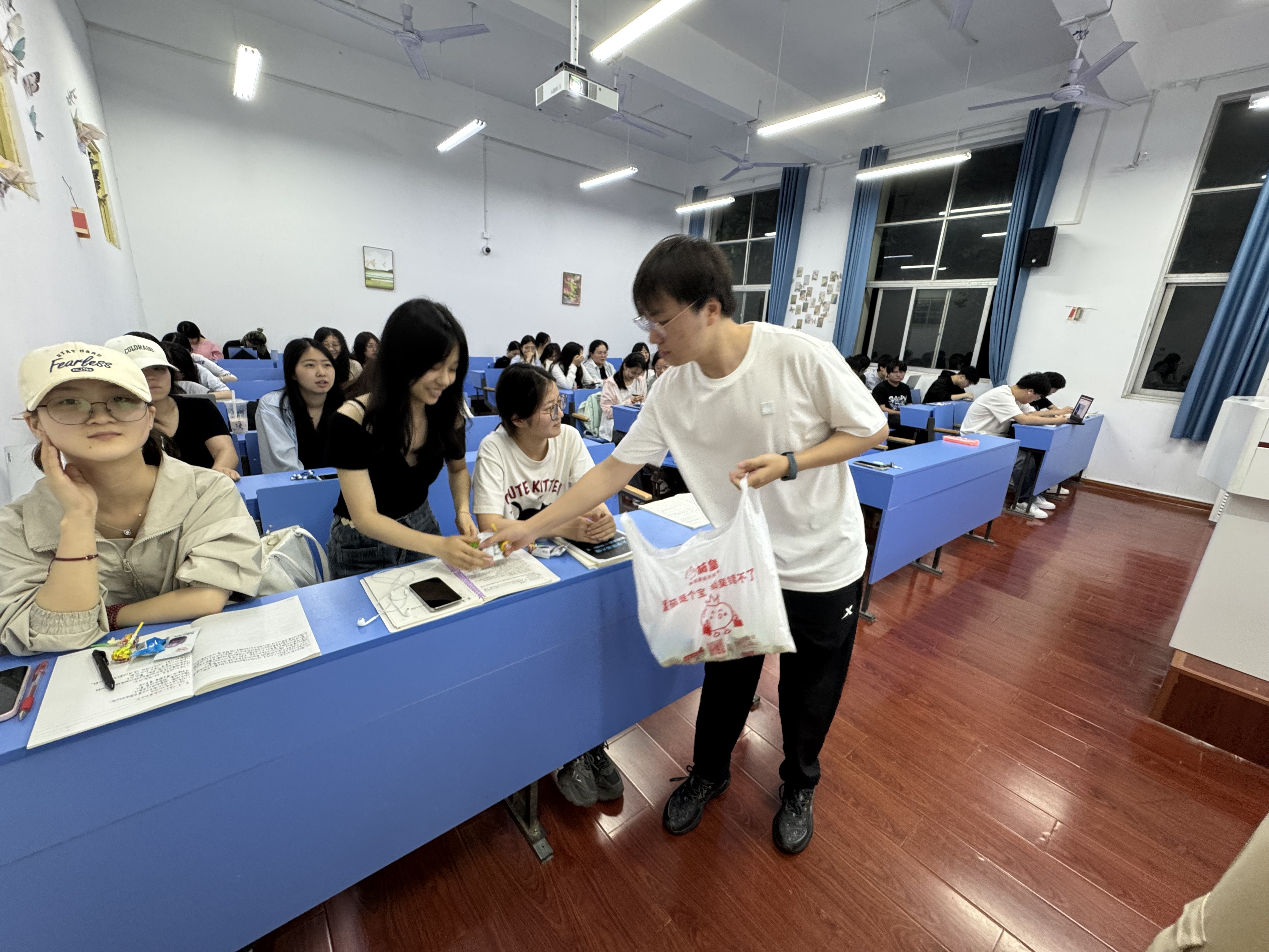 在讲解完规定后,班会进入互动环节,包括有奖问答和放松练习。有奖问答设计了一系列与考风考纪相关的问题,例如“严重警告受处分的期限是多少个月?”“无故旷考者,给予什么处分?”等。同学们积极参与,争相举手回答,回答正确的同学,获得了签字笔等小礼品作为奖励。放松练习则是由社会工作研究生志愿者们带领同学为应对考试压力,学习一些放松技巧。互动环节活跃了班会气氛,也帮助每位同学将拒绝作弊内化于心、外化于行,共同营造一个公平、公正、诚信的考试环境。