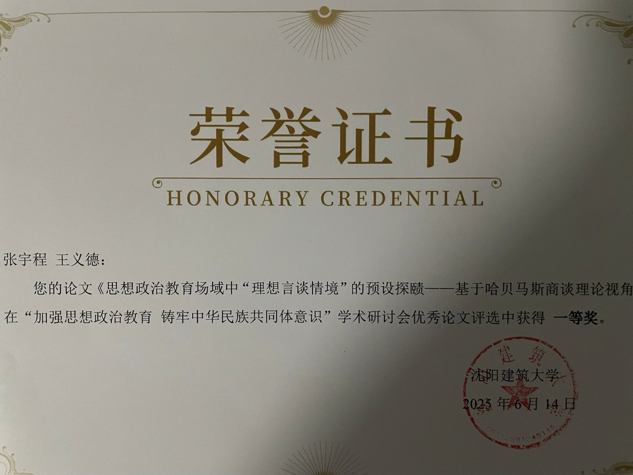 2025年6月14日,由沈阳建筑大学主办,沈阳建筑大学马克思主义公司以及沈阳市生态文明理论与实践研究中心承办的“加强思想政治教育 铸牢中华民族共同体意识”学术研讨会在辽宁省沈阳市举办。公司2023级政治学专业硕士研究生张宇程应邀参会。