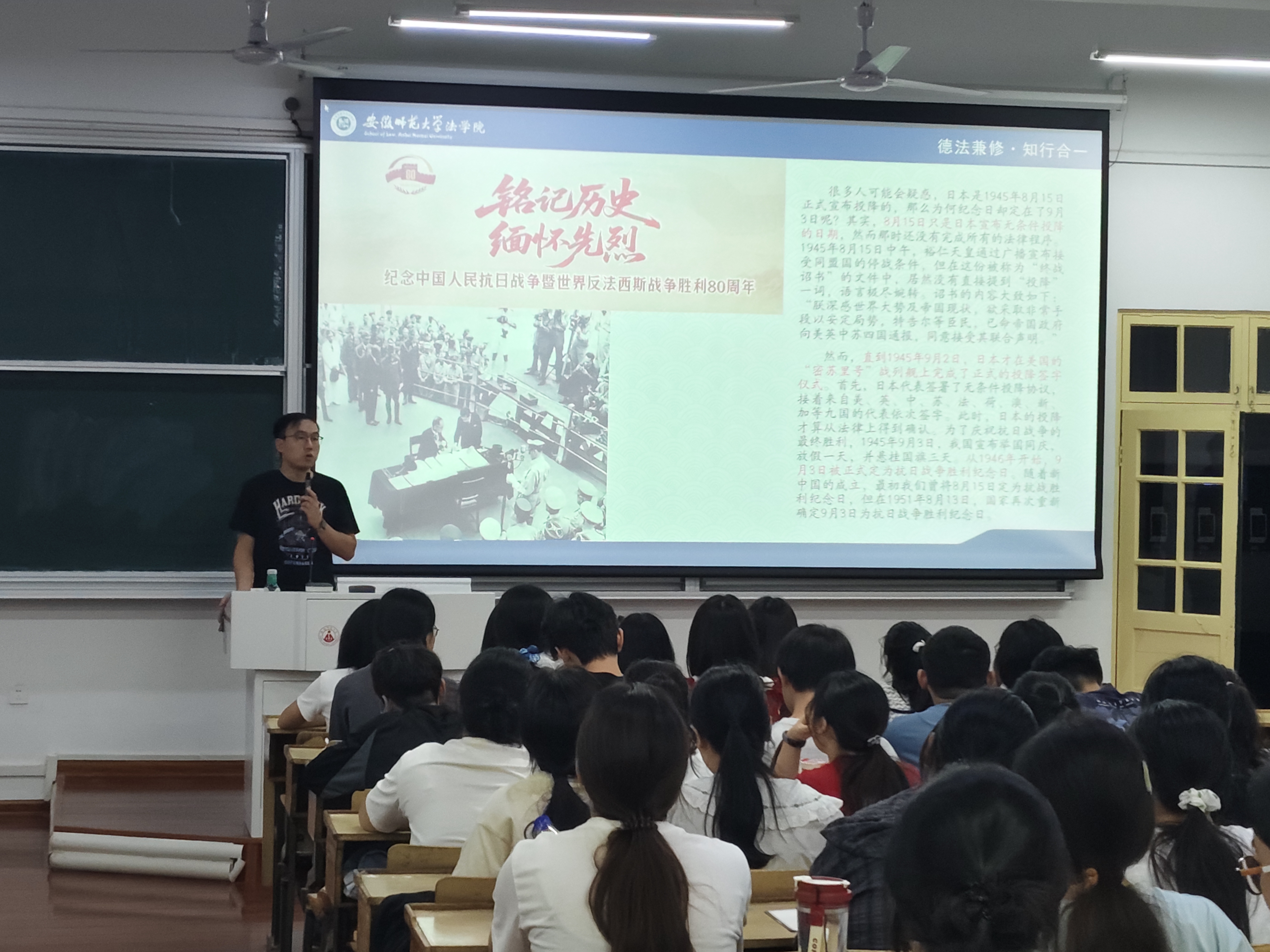 铭记光辉历史,厚植家国情怀。恰逢中国人民抗日战争暨世界反法西斯战争胜利80周年,崔健带领同学们回溯了那段波澜壮阔、艰苦卓绝的抗战岁月,通过精选的影视片段和真实的历史文献,同学们深刻感受到了革命先辈们天下兴亡、匹夫有责的爱国情怀和视死如归、宁死不屈的民族气节。崔健结合法学专业的特色,引导同学们思考如何将抗战精神中蕴含的坚韧不拔、追求正义的内核与未来的法律学习实践相结合,将爱国之情转化为强国之志、报国之行。