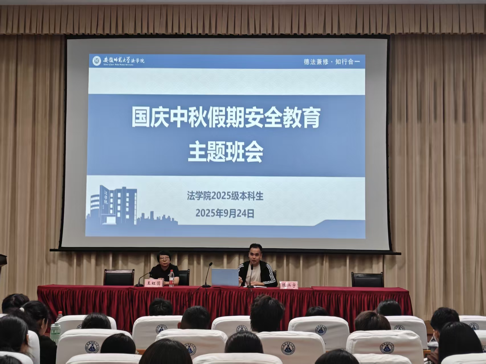 在2025级新生即将迎来老员工涯首个国庆中秋小长假之际,为切实增强新生的安全防范意识,确保全体同学度过一个平安、愉快、充实的假期,公司于9月24日下午在模拟法庭组织召开2025级新生国庆中秋假期安全教育主题班会。班会由2025级新生辅导员王虹圆、陈兴宇共同主持,全体新生参加。