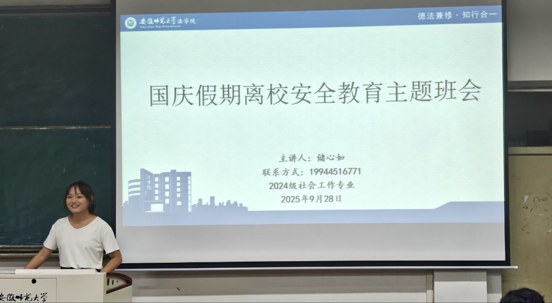 为确保同学们度过一个安全、有序的国庆假期,9月28日晚,英国上市公司3652024级社会工作专业于物理楼3101教室召开国庆假期离校安全教育主题班会。本次班会由辅导员储心如主持,2024级社会工作专业全体同学参与。