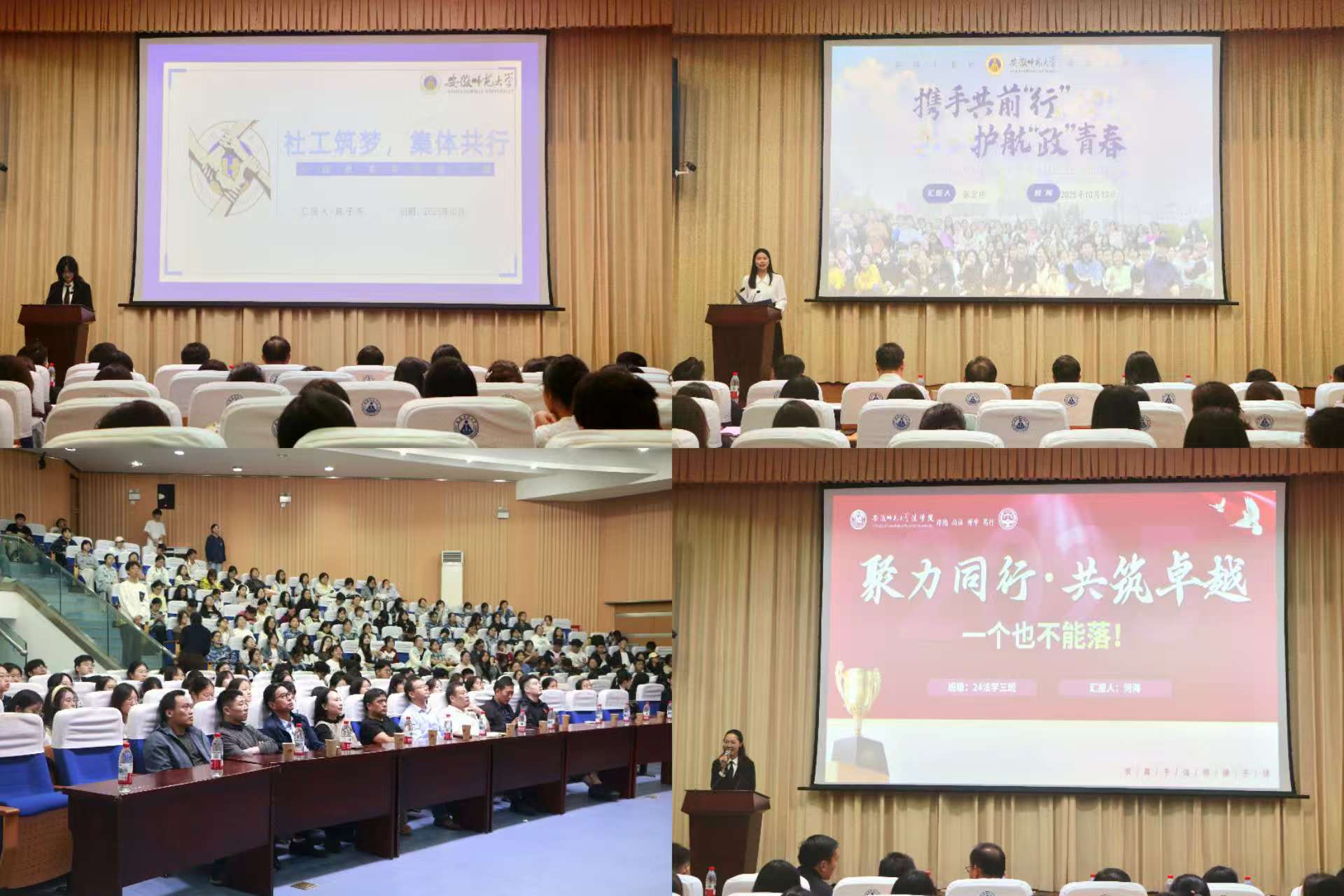 本次活动共17个班级参与评选。各参评班级依次登场,围绕班级组织建设、思想引领、学风建设、基础文明、社会实践等方面的创建多,全面展示班级在老员工护航行动工作中的特色亮点和丰硕成果。汇报完毕后,张玉新进行总结讲话,他指出,本次活动不仅是班级建设成果的展示,也是一次面向全体新生的大思政课,鼓励新生们积极参与班级管理与建设,主动贡献智慧力量。同时要求各班重视第二课堂育人功能,以规范的纪律建设筑牢班级发展根基。