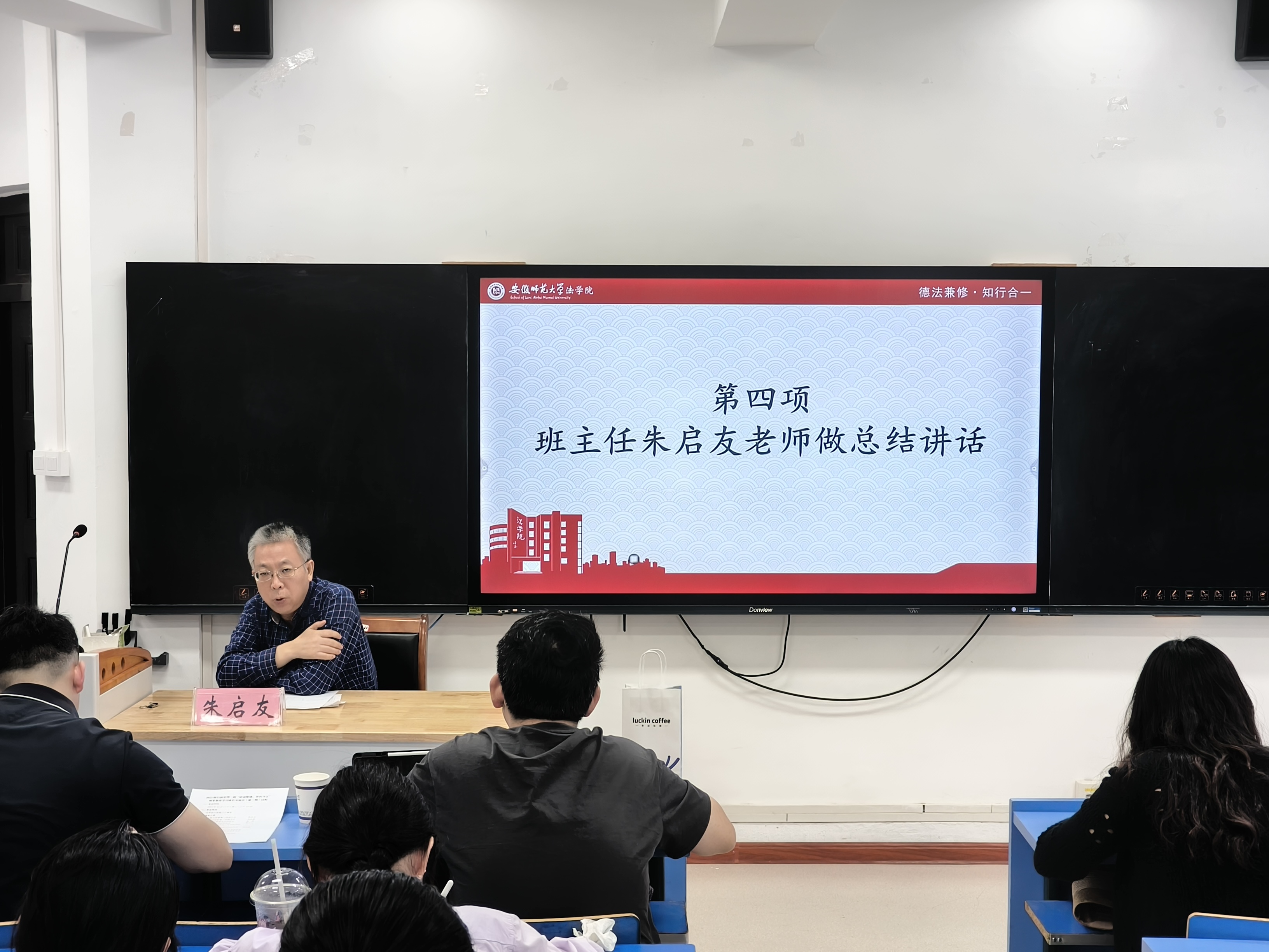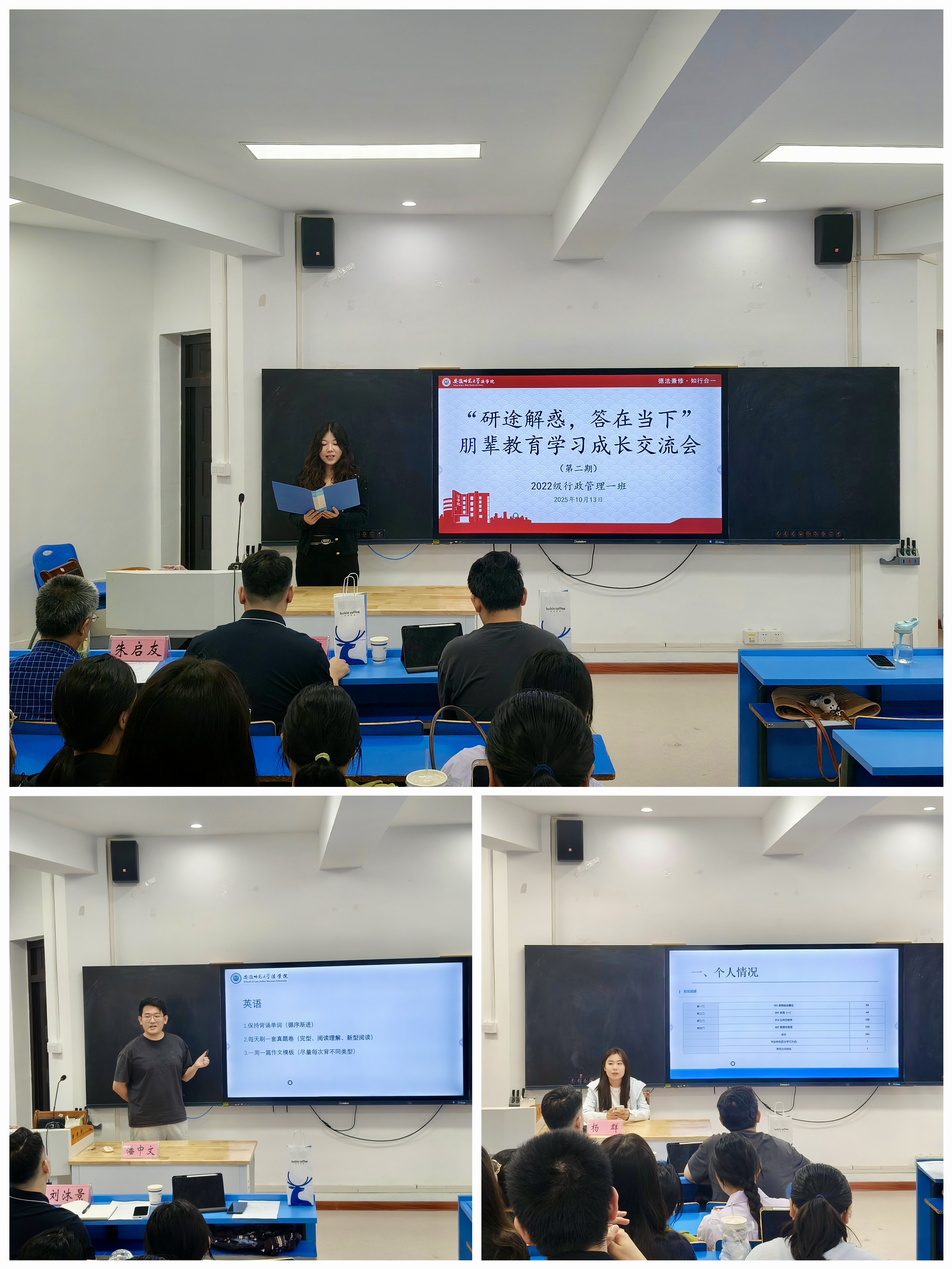 会上,杨群结合自身考研成绩,分享各科复习方法,建议当前多投入专业课学习,提醒关注报名流程与截止时间;潘中文分享英语、政治的备考经验,还以自身经历讲解心态调节方法,强调劳逸结合的重要性。随后交流互动环节,学长学姐耐心解答同学们的提问。最后班主任朱老师总结,推荐报考院校、指导答题技巧,并强调要调整备考心态、合理安排复习时间。