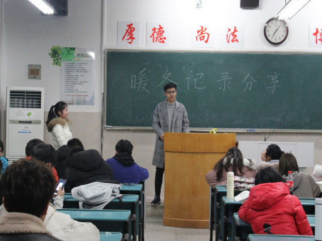 会议伊始,同学们通过各种形式展示了自己的暖冬活动成果,记录了社会基层人民生活的酸甜苦辣。这其中有下乡民调的,用青春助力扶贫的;有参加志愿服务的,用自己的行动温暖社会的;有跟随老师下乡送温暖的,帮助贫困果农卖水果的等。寒假转瞬即逝,可回首寒假,这些暖冬行动在同学们的脑海里刻下了深刻的痕迹,这些行为或许微不足道,但却可以让每一个接受帮助的人在这个寒冷的冬天感受到阵阵暖意。
