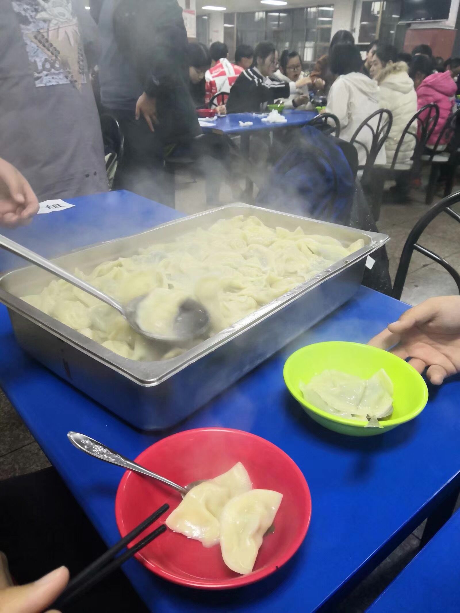 在煮饺子的过程中,男生从三楼端来了事先准备的火锅,18级同学张喆为大家带来了吉他弹唱,现场氛围十分热烈。热腾腾的饺子出锅后,各小组有序的领取自己组的“劳动成果”。吃着自己包的饺子,每位同学都格外的开心。食堂工作人员以及在食堂就餐的其他公司的同学也同大家一起品尝饺子和火锅,整个食堂都充满着浓浓的节日韵味。吃完饺子后,大家一起合影留念并帮助食堂工作人员收拾桌子碗筷。