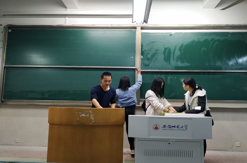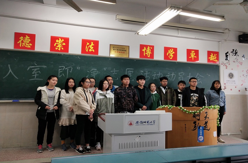 活动伊始,主持人王鸽鸽上台发言,对活动进行了简单的介绍和动员。六大社团的代表上台发言,青年法学社代表围绕活动过程展开讲话,说明在活动过程中会有工作人员实时检查活动情况,同时又简单说明本次入室即“净”活动是以打扫教室、营造良好学习环境为主的志愿行为。六大社团的代表们均强调了本次活动的重点:弘扬志愿精神。发言结束后与会成员以社团为单位合影留念。随后志愿者们便开始了紧锣密鼓的准备,大家任务分配完成后,就开始对教室进行打扫。志愿者们齐心协力,各司其职,很快就将教室打扫得焕然一新,干净的地面,整齐的讲台,洁净的黑板,无一不是志愿者们辛勤劳动的成果。志愿者们在劳动奉献中体会与分享乐趣,和谐温馨的劳动氛围也拉近了大家之间的距离。