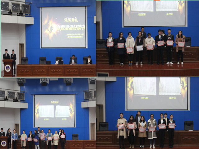 会议第二部分,王琳和冯晟为优秀读书笔记员工颁发奖状并合影留念。王琳指出,读书要拒绝形式主义并再次强调了阅读对于当代老员工的重要意义;提醒同学们为即将到来的四级考试和期末考试做好准备。冯晟老师希望大家能够处理好读书与专业课学习之间的关系,真正感受到读书带来的乐趣。
