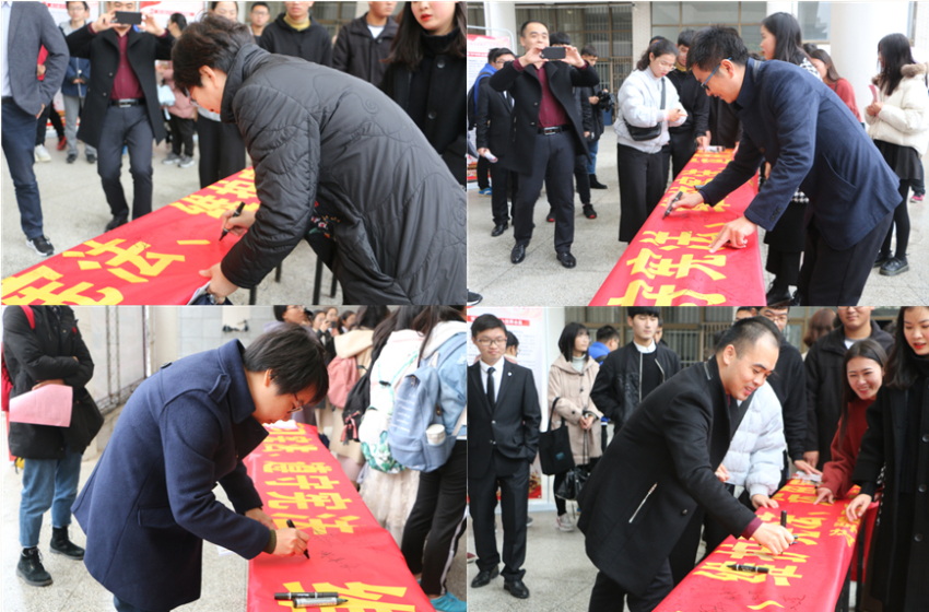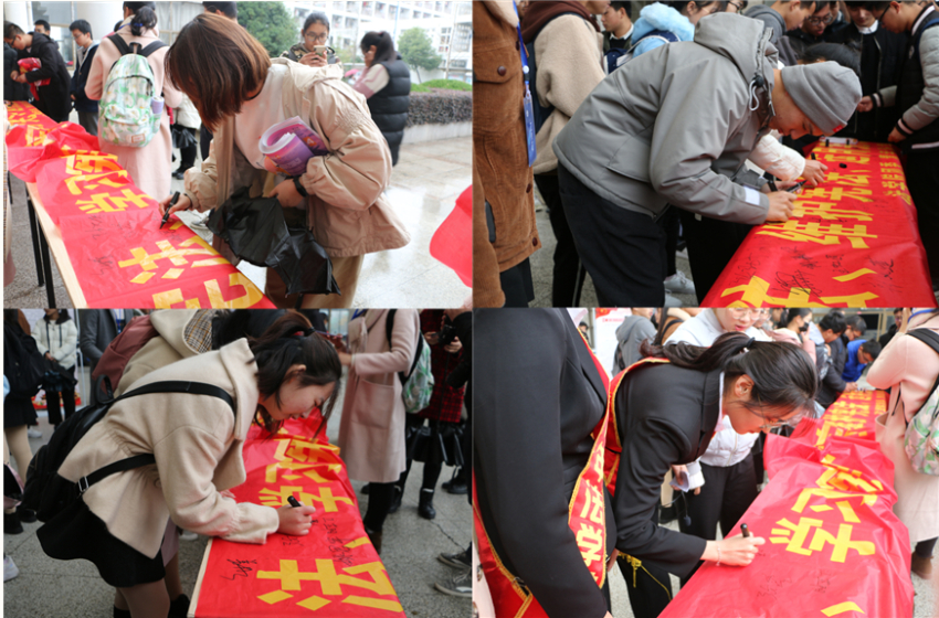 活动伊始,青年法学社宣讲团代表向老师、同学们讲解了与国家宪法日相关的内容,如宪法的历史沿革、宪法规定的公民基本权利与义务、宪法精神及其意义以及12.4国家宪法日主题与设立目的等。宣讲员围绕改革开放与法治进程的三个阶段介绍二者的紧密关系,第一阶段以党的十一届三中全会为开端,第二阶段从1996年八届全国人大四次会议开始,第三阶段则从党的十八大开始至今。重点讲述了2018年全国两会的主要内容,指出2018年是一个关键年份,这一年发生了宪法修改、国家监察委员会成立、国家机构改革、习近平总书记发表相关重要讲话等与法律息息相关的重大事件。宣讲结束后,老师与同学们合影留念,并在横幅上签上自己的名字。