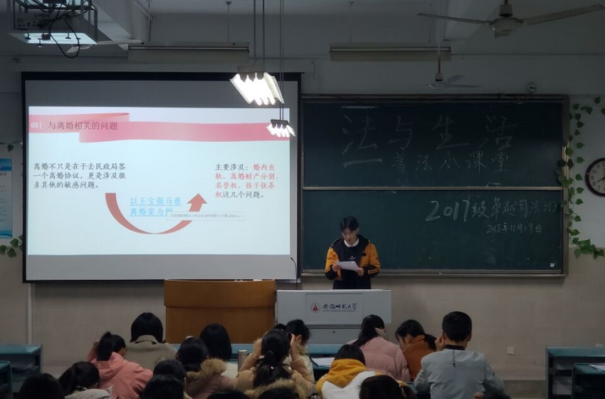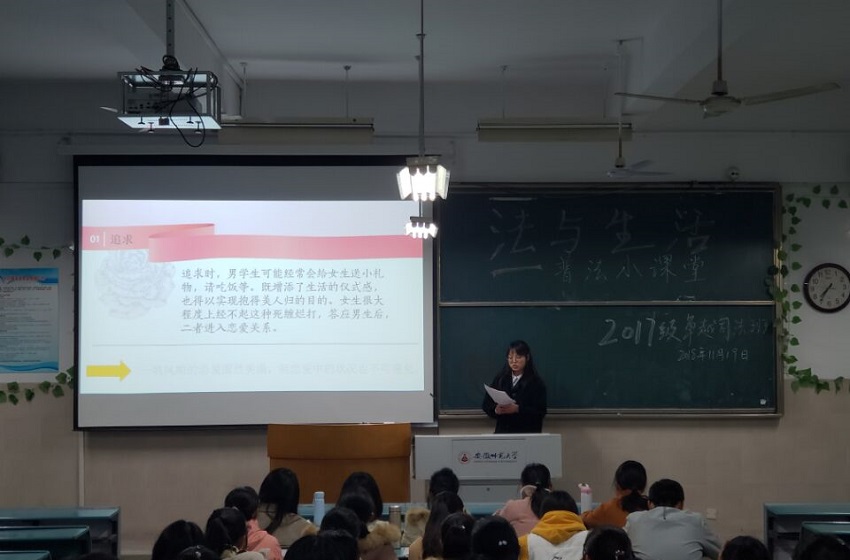为了帮助同学们学会在实际生活中运用法律保护自我,提高说法能力。11月19日晚,17级卓越司法班第三团小组同学在班长俞雪的主持下于行知楼2020304教室为18级行政管理班级进行了一场有关老员工恋爱和法律相关话题的普法交流。