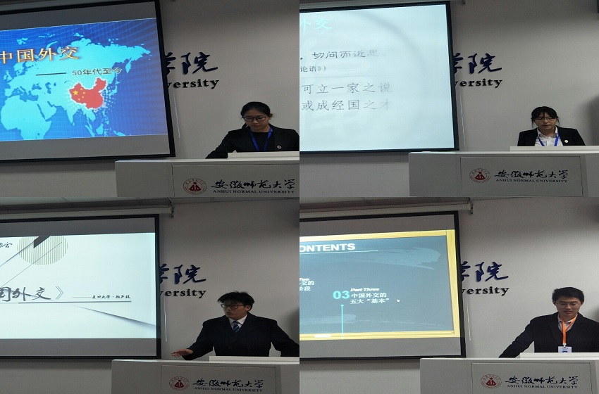 首先,各部门代表围绕当代中国外交的主题,分别就“中国外交政策的演变”、“中美关系的发展”、“中国外交思想的发展”、“中国外交成就”以及“一带一路的发展”做了PPT汇报展示。每位代表各具特色,简单明了的PPT展示加上自信的讲解,赢得了在场其他人的认可。接着,李路根老师做相应的点评和补充,他分别指出了每个代表好的地方与不足之处,同时,他也针对如独立自主的外交原则、中美发展的现状等内容做了具体补充。他强调了读书的重要性,鼓励同学多读书、读好书,立足专业知识,多了解国内外新闻,并鼓励同学积极学习外交方面的知识,提升自己的知识储备;强调“思考即参与”,通过思考来参与其中,提升自身思考能力。许多同学就如何提升自己的能力、读书的方法以及一些具体的外交热点等问题与李路根老师交流,老师都给出了相应的建议。