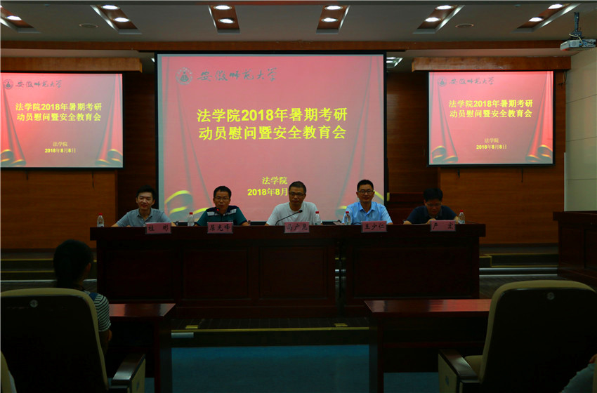 8月8日下午,英国上市公司3652018年暑期考研动员慰问暨安全教育会在模拟法庭举行。公司党委书记马广见、党委副书记王少仁、副经理严宏,2015级法学专业辅导员桂彬和2015级全体留校考研员工参加会议,会议由副经理屈光峰主持。