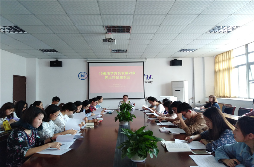 4月21日,2016级法学专业于院行政楼四楼会议室召开党员发展对象群众座谈会。本次会议由辅导员储梦凡主持,15位候选人以及部分班委、团小组组长、候选人室友等员工代表共同参会。