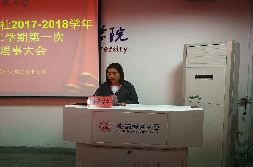 会议伊始,各部门理事代表发言,代表们身着正装,围绕着上学期开展的各项工作,指出自己的不足,表达了自己的心得体会和努力学习工作技能的决心。此外,各部长根据本部门的工作特性对上学期理事们的工作做了评价,提出了下学期的工作要求。组织部部长郭潇遥提议完善并遵守社团制度,实践部副部长吴柔提出部门要多组织例会,加强沟通交流等。会长团代表郑卓则就以上发言做了简单的总结,指出不仅理事们要加强学习的主动性,部长们也要教导到位。会议最后,李路根老师就去年青年法学社荣获安徽省首届“十大法治人物”对全体社团成员给予了肯定赞扬,并表达了将普法与扶贫、支教相结合的期望,提出了将青法社理论研究与创新活动相结合、加强人才培养等工作要求。会议在各成员共同交流想法后圆满结束。