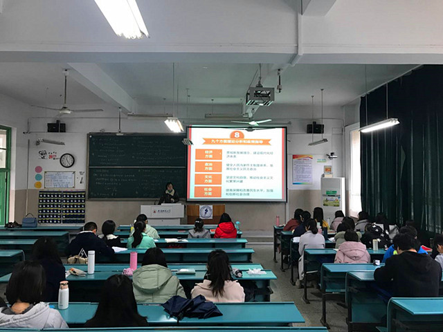 会议伊始,瞿老师向同学们详细介绍了十九大的基本情况,带领同学们学习了十九大的主题。随后,瞿老师从十个方面历史性成就、两个重大判断、一个历史使命与“四个伟大”、一个重大思想、十四条基本方略、两个重要时期、两个阶段、九个方面理论分析和政策指导八个方面展开论述,让同学们更加深入地学习领会了十九大报告。瞿老师谈到,此次班会旨在让同学们深入学习好、理解好、贯彻好十九大精神,也希望同学们在生活和学习上要积极贯彻落实十九大精神,为未来发展奠定基础,指引方向。