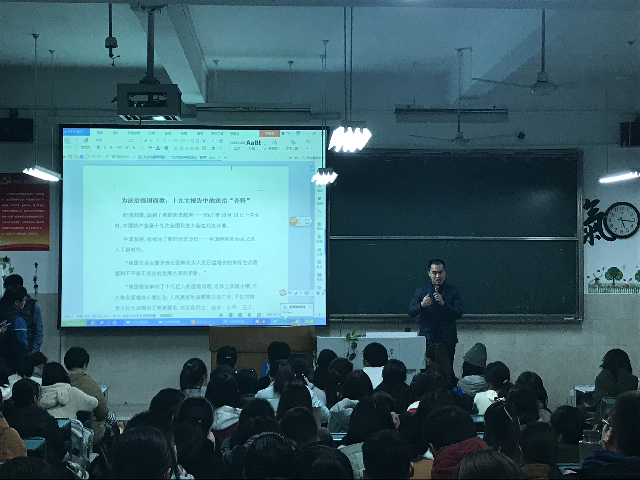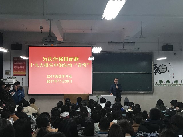 11月30日下午,在行知楼2020104教室,17级法学举办专业《为法治强国而歌,十九大报告中的法治“音符”》学习十九大报告主题班会,班会由辅导员陈兴宇老师主持并进行宣讲。