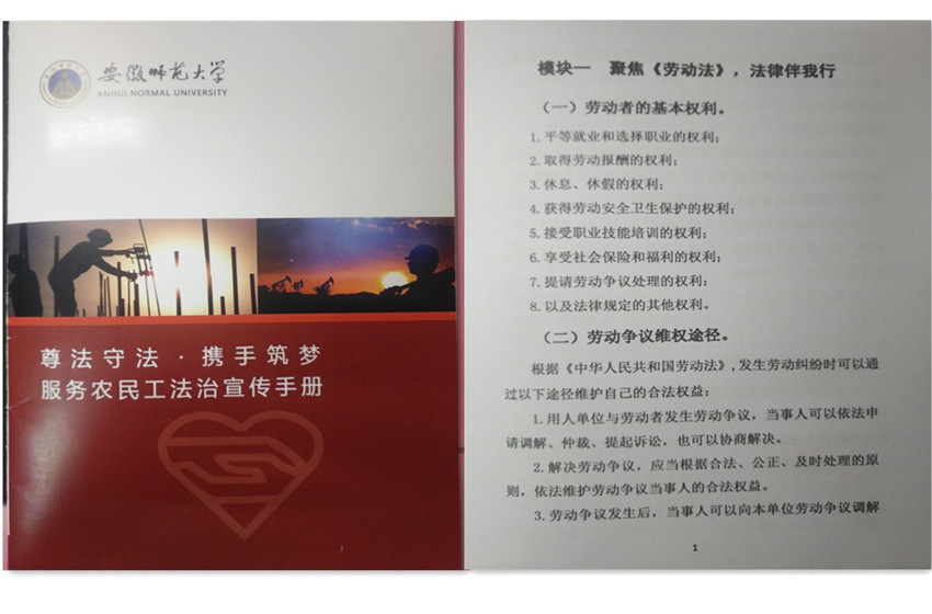普法活动前,社团工作人员搜集汇总与农民工兄弟利益相关的问题,结合调查结果排版印刷了《“尊法守法·携手筑梦”服务农民工法治宣传手册》,并制作了“聚焦《劳动法》,法律伴我行”、“解读《劳动合同法》,助力农民工维权”、“工伤问题”、“社会保障问题”、“农民工子女教育问题”宣传展板,采取图文结合形式以助农民工兄弟理解。活动当天,社团参与人员快速搭建展架,并为前来听讲的农民工一一分发宣传册。宣讲员陆冰冰与秦修军则结合宣传展板,有重点地讲解了《劳动法》、《劳动合同法》、《中华人民共和国义务教育法》等多部法律法规的相关内容,将生涩难懂的法条通俗化、简单化,使农民工兄弟听进去、听明白。活动结束后,社团人员及时展开讨论,在听取老师建议后表示将会不断改正,在下次活动中再接再厉。