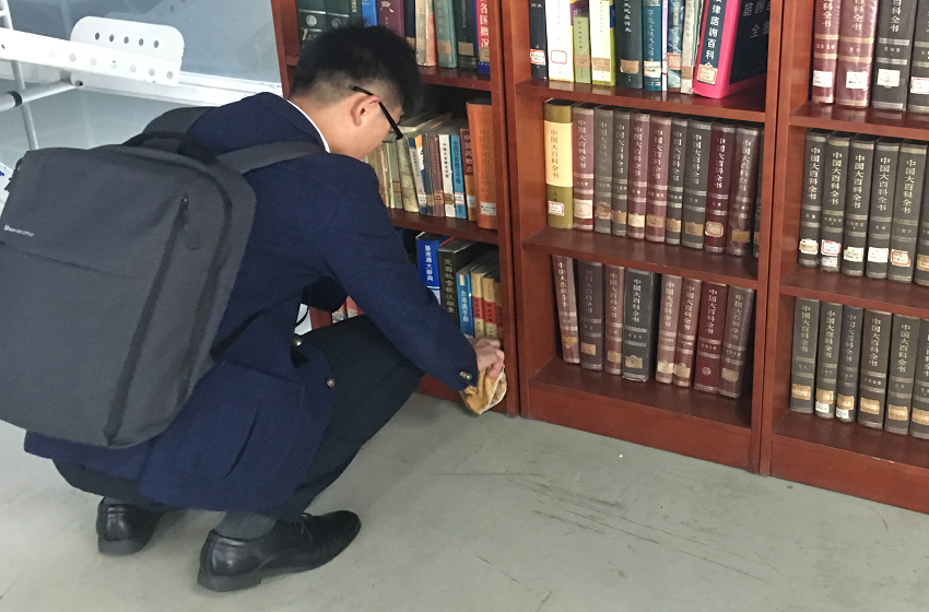 活动伊始,组长李青文将全体党员分为4个小分队,分配任务。接着,党员们分别到图书馆二楼、三楼的科室内与值班老师交接,开始整理书籍并打扫科室卫生。每一位党员在图书管理员的指导下,正确查找编号、整齐摆放书籍、仔细清理垃圾,各司其职,给广大读者创造美好整洁的阅读环境。