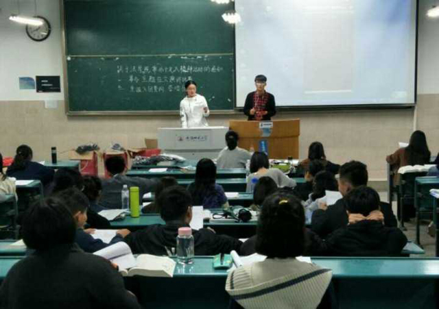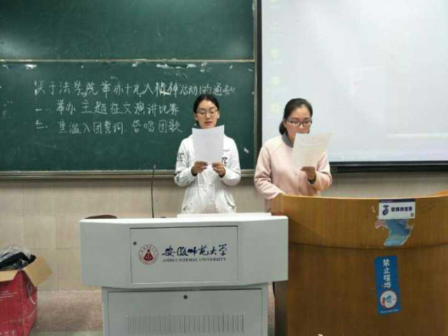 活动持续约半个小时,法学二班的团支书张万红首先上台宣誓入团誓词,之后由班级素拓委员李诗情上台带领大家学唱团歌,期间,院员工会文艺部孙志峰及法学一班素拓委员均有上台教唱。同学们表现良好,态度端正学的都很认真,几遍下来便大致学会了唱团歌,最后以一遍铿锵有力的大合唱开始了之后的自习。
