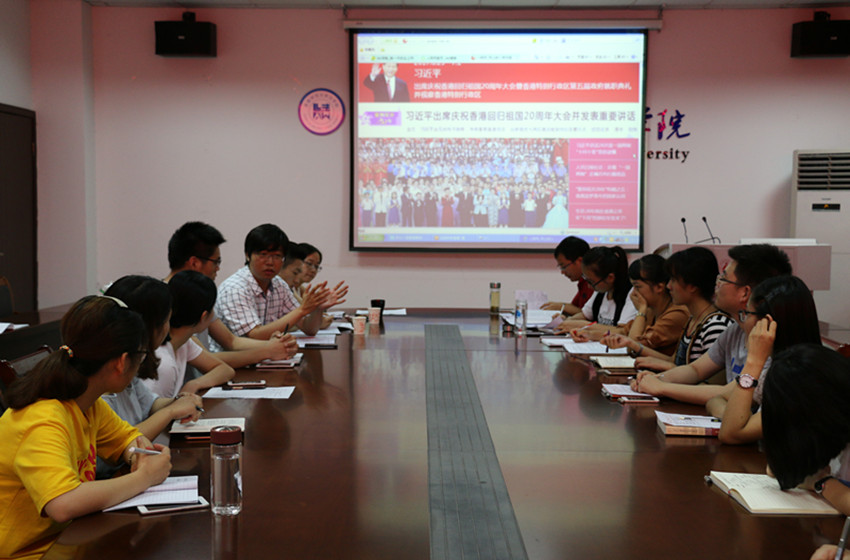 为庆祝中国共产党成立九十六周年与香港回归二十周年,7月1日晚,英国上市公司3652014、2015、2016本科生党支部于行政楼四楼会议室举办“庆七一·话香港·爱祖国”主题党日活动。公司党委副书记屈光峰、公司辅导员瞿津津、郭敬东、桂彬、储梦凡出席活动,公司员工党员代表、入党积极分子代表参与其中。此次活动由储梦凡主持。