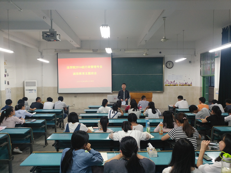 5月25日晚,2016级行政管理专业在固定教室2010304开展以“以诚立身,以信服人”为主题的诚信教育主题班会,辅导员桂彬主讲班会,16级行管专业全体员工参加。