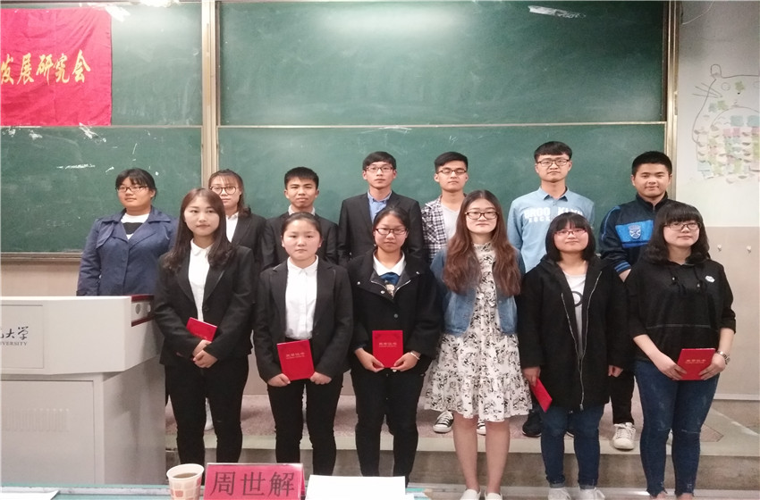 4月15日晚,职研会在2020303教室举行颁奖典礼。职研会会长周世解、青法社代表张楠楠、外协代表孙瑞担任本次颁奖典礼的嘉宾,职研会全体工作人员到达现场。颁奖结束后,全体获奖成员与颁奖嘉宾合影留念。最后,优秀会员代表就在此次活动中的感受、收获及对未来的展望进行发言。