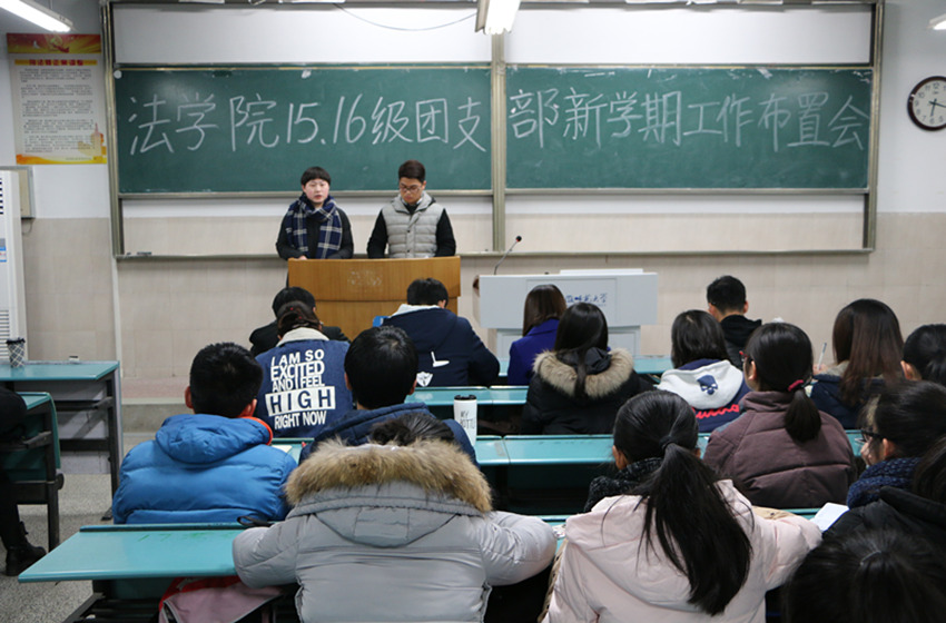 会议伊始,邹传奇进行上学期的工作总结,指出班级团支部在上学期的工作中存在布置的工作与上交的工作有偏差、上交的文件格式字体及其它方面不符合要求和上交材料的时间拖延三大问题,希望各班级团支部成员能够增强团员身份意识,努力做好工作,为班级同学树立榜样。吴佳佳则对新学期的系列工作进行安排,就三会两制一课、雷锋月系列活动、律政菁英以及魅力团支书等活动进行了详细地介绍,侧重解释了三会两制一课的要求,期待各班级能够将三会两制一课活动落于实践,并强调团支部成员在工作时要注重进行班级同学的思想建设。
