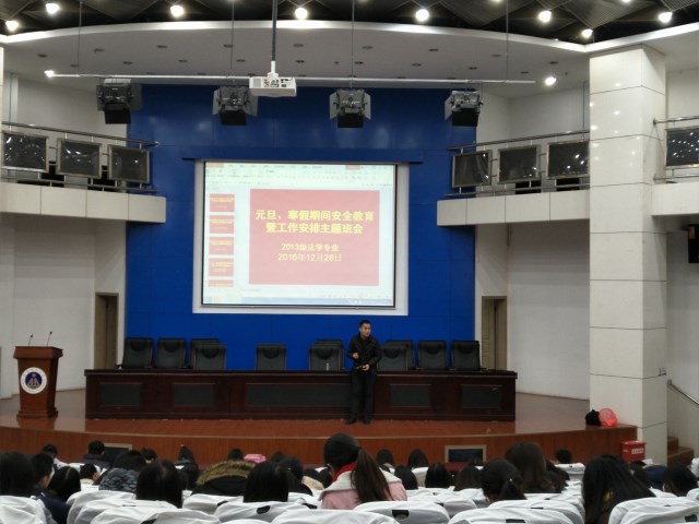 12月28日下午,在敬文报告厅,2013级法学专业召开元旦、寒假假期安全教育暨工作安排主题班会,会议由辅导员陈兴宇主持,班级全体同学到场。