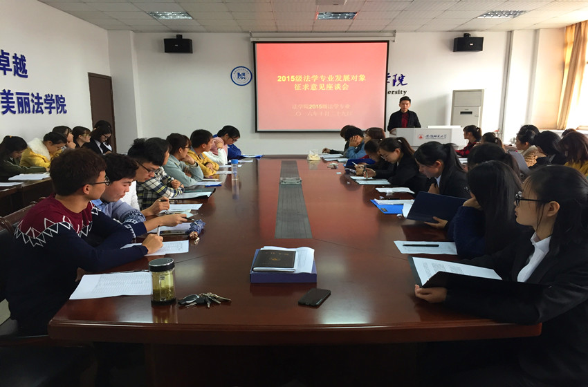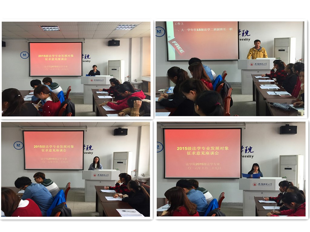 10月29日中午,2015级法学专业党员发展对象征求意见座谈会于行政楼四楼会议室成功召开。15级法学专业辅导员桂彬担任会议主持人,24位党员候选人、各班寝室长、团小组组长以及员工代表到场参与此次会议。