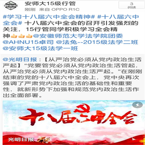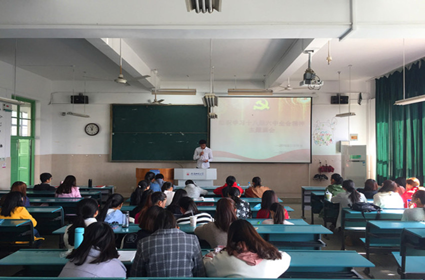 11月2日上午十一点,15级行政管理班级在行知楼2020303教室开展学习十八届六中全会精神主题班会,此次班会由心理委员黄威主持召开,全体行管同学参加。