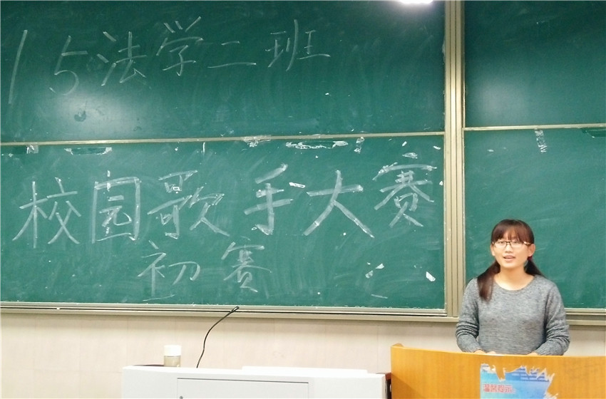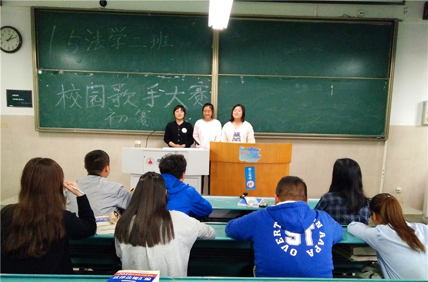 9月30中午,为选拔公司公司举办的“校园歌手大赛”参赛者,2015级法学二班在行知楼进行了校园歌手大赛班级初赛。比赛由文娱委员孙瑞同学主持,由班委、团小组长等8人作为评委,以及28位比赛选手以及其它观赛同学参加。